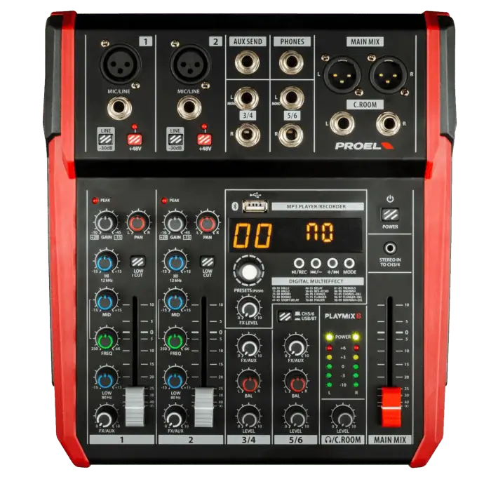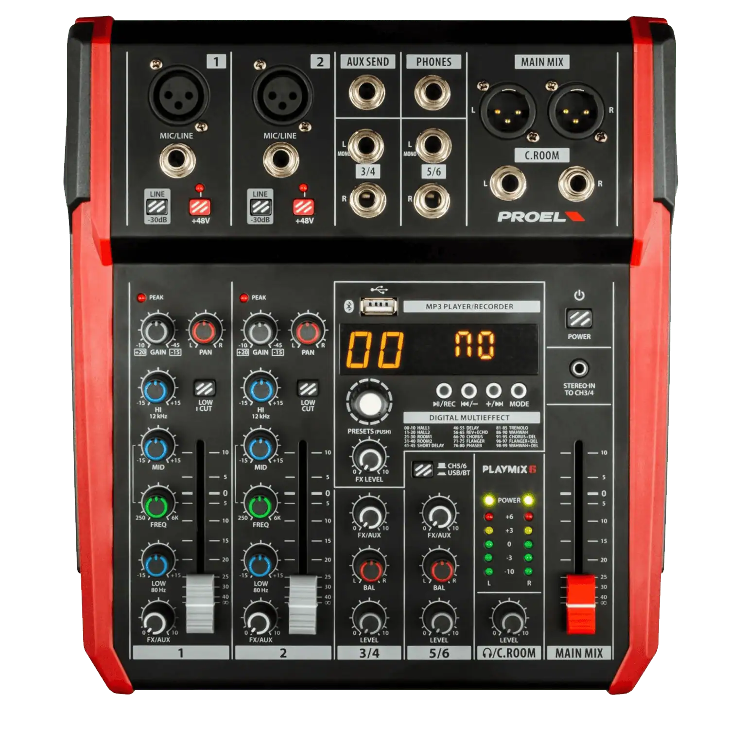 I mixer proel playmix sono disponibili in 3 modelli, con le stesse funzioni di canale e master, ma con 6, 8 e 10 canali rispettivamente. I canali mono mic/line includono pre amplificatori microfonici a basso rumore e ad alta dinamica, equalizzatori a tre bande con MID parametrici e filtro HPF, e fader da 60 mm per un controllo completo del suono. Tutti i modelli sono dotati di un’avanzata sezione digitale con display LCD, che comprende: un DSP integrato a 24 bit di alta qualità, con 100 preset da studio di effetti singoli e combinati, un’interfaccia audio USB stereo a 48 KHz per la riproduzione/registrazione tramite connessione al PC, un lettore MP3 integrato dalla chiave di memoria USB o dall’interfaccia bluetooth, registrazione stereo su chiave di memoria USB. I mixer sono alloggiati in robuste scocche che garantiscono una lunga durata e offrono un suono pulito e preciso per una vasta gamma di applicazioni.