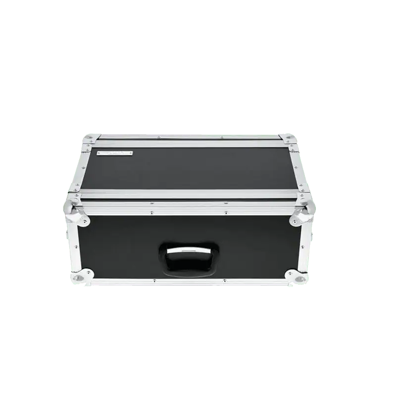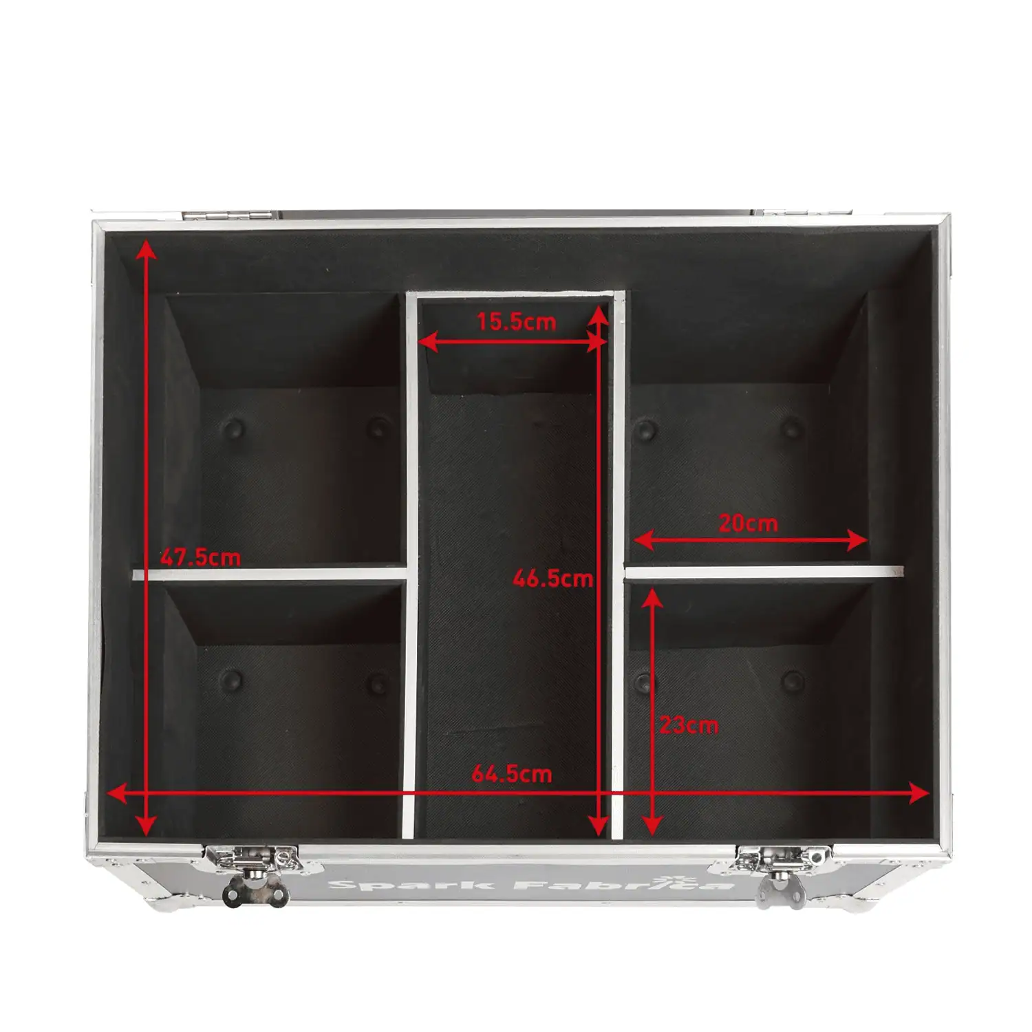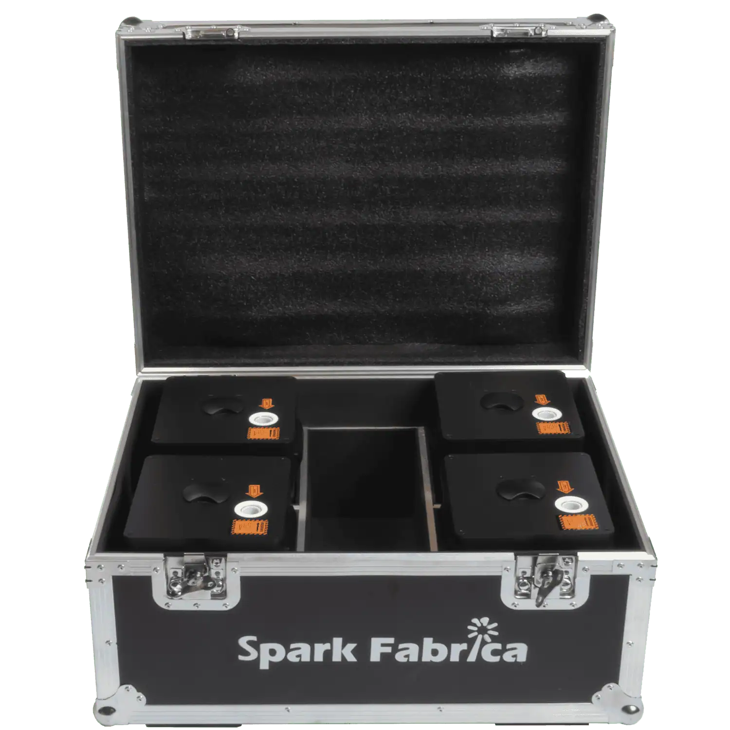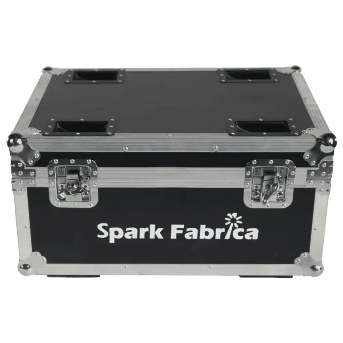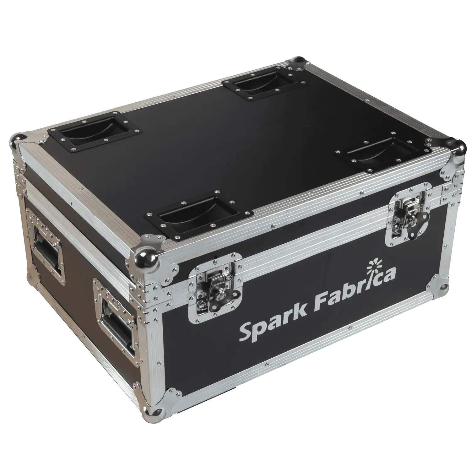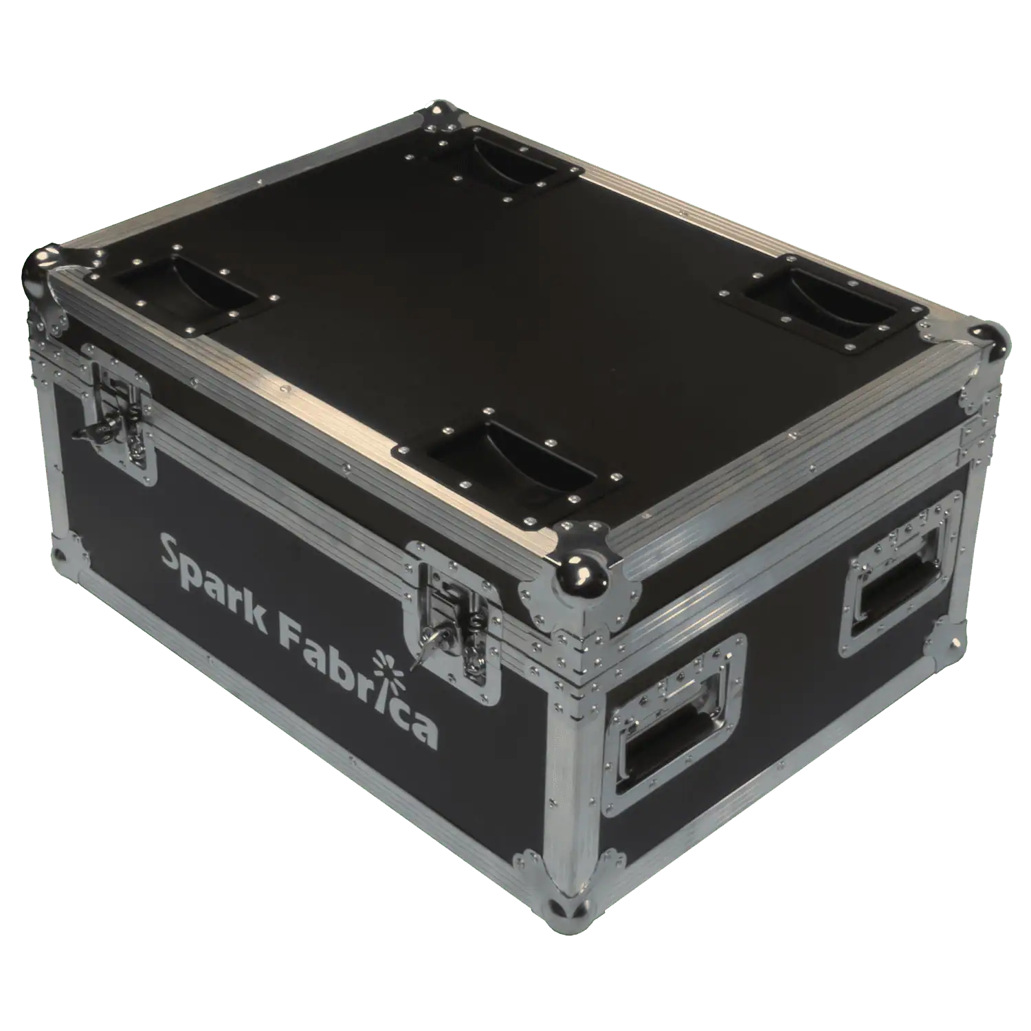 Baule flightcase rigido per il trasporto di 4 macchine spark fabrica m3, con quattro vani interni e un vano centrale per cavi e accessori. Realizzato in multistrato di betulla, con maniglie laterali e chiusure a farfalla.