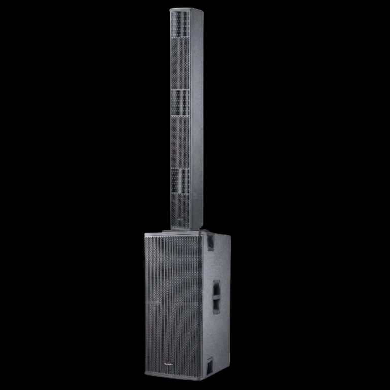 Impianto audio a colonna ADMARK T-6 + T6-S con colonna professionale e subwoofer doppio 15” amplificato 2000W. Sistema audio ideale per concerti, eventi e DJ set.