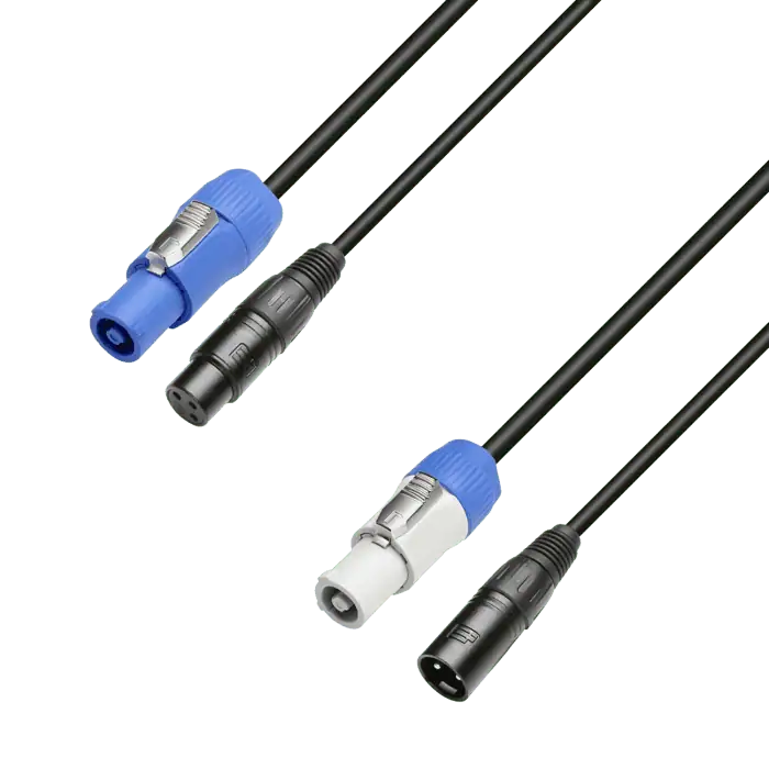 Cavo ibrido di alimentazione elettrica e segnale audio combinati in un unico cavo, con Powercon A e XLR da un lato e Powercon B e XLR dall’altro. Con sezione del conduttore di cavo DMX 2 x 0,22 mm² e cavo di rete 3 x 1,5 mm². Perfettamente adatto per l’alimentazione in parallelo di dispositivi con potenza e segnali DMX, include guaina termo restringente trasparente e sciolta per l’etichettatura del cavo.