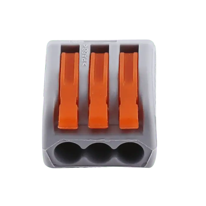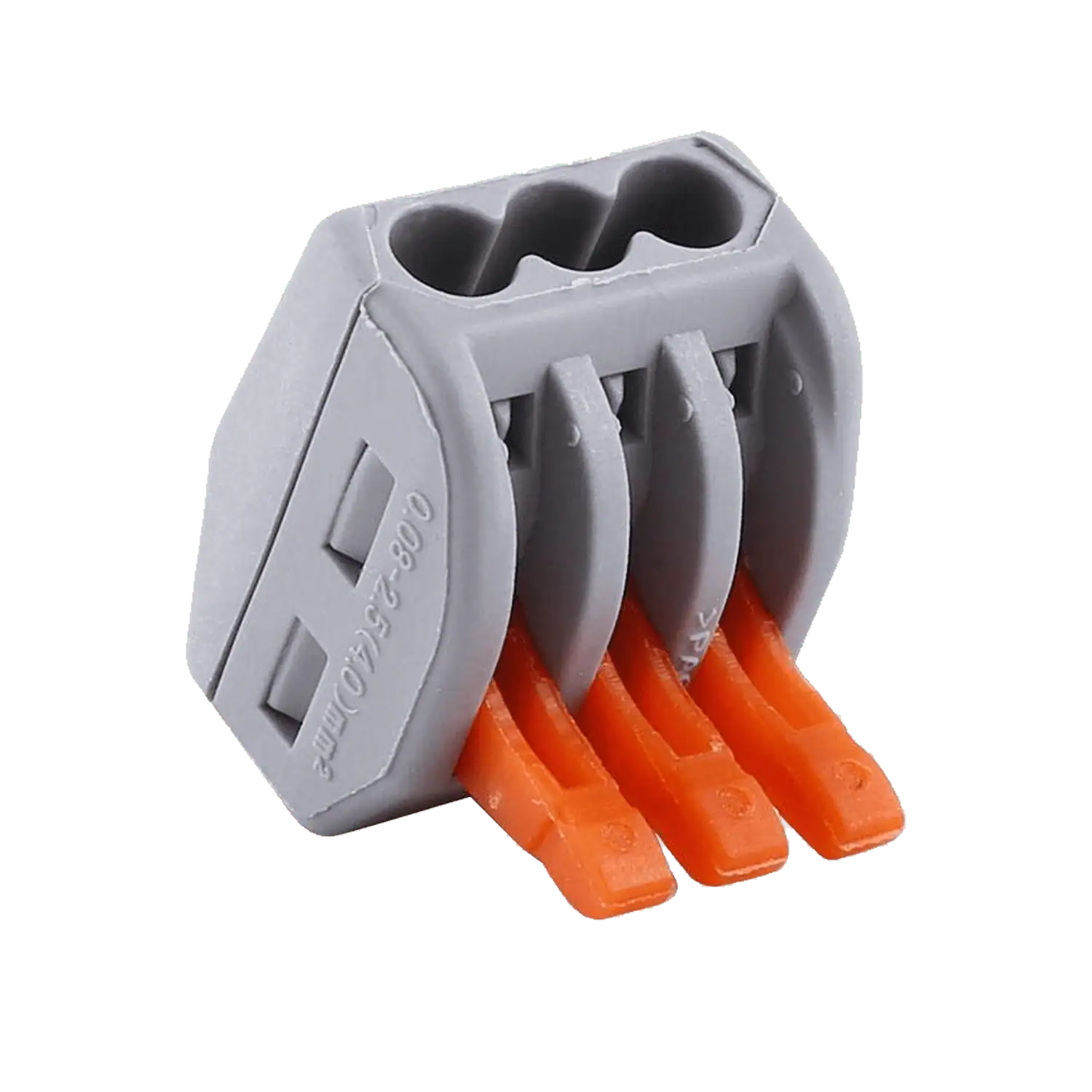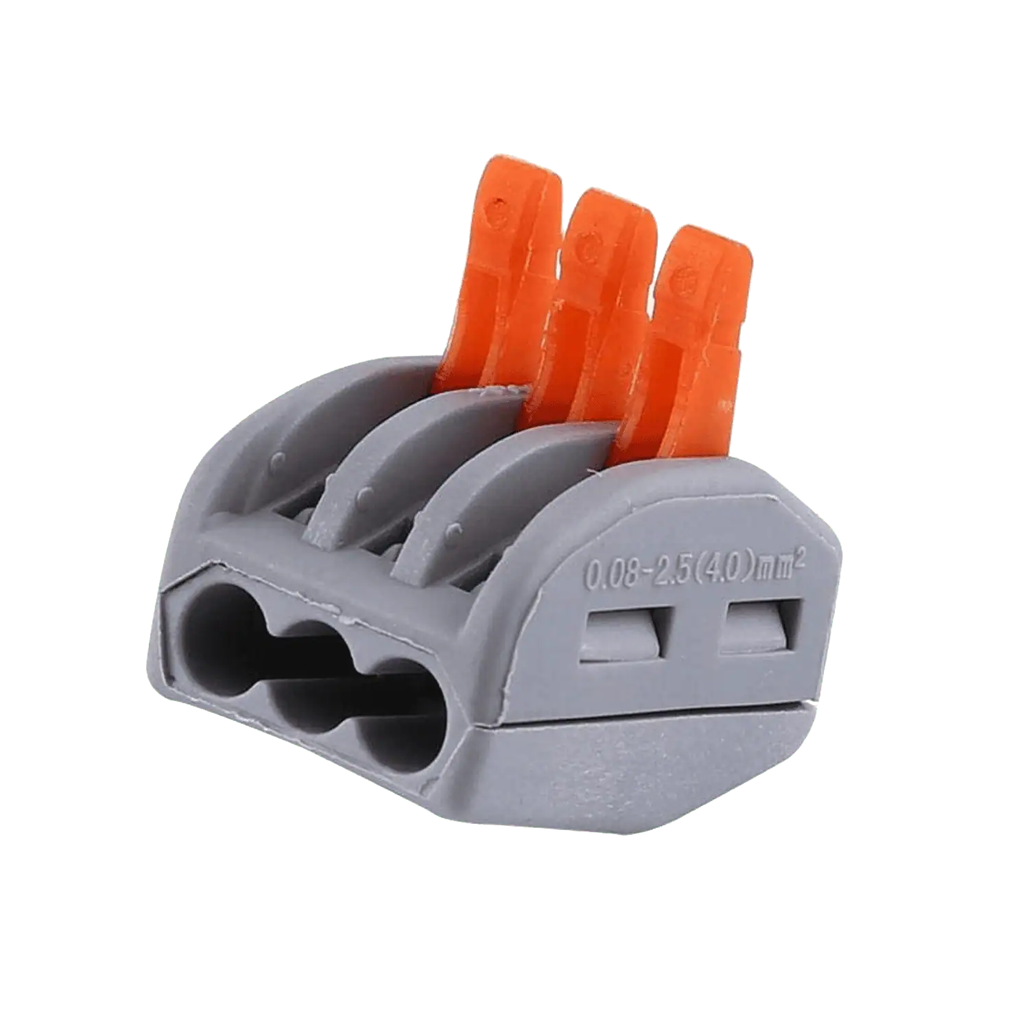 Connettore universale a 3 poli 1 via per cavi, ideale per connettere cavi in scatola in totale sicurezza e praticità. Dotato di foro per test nella parte superiore.