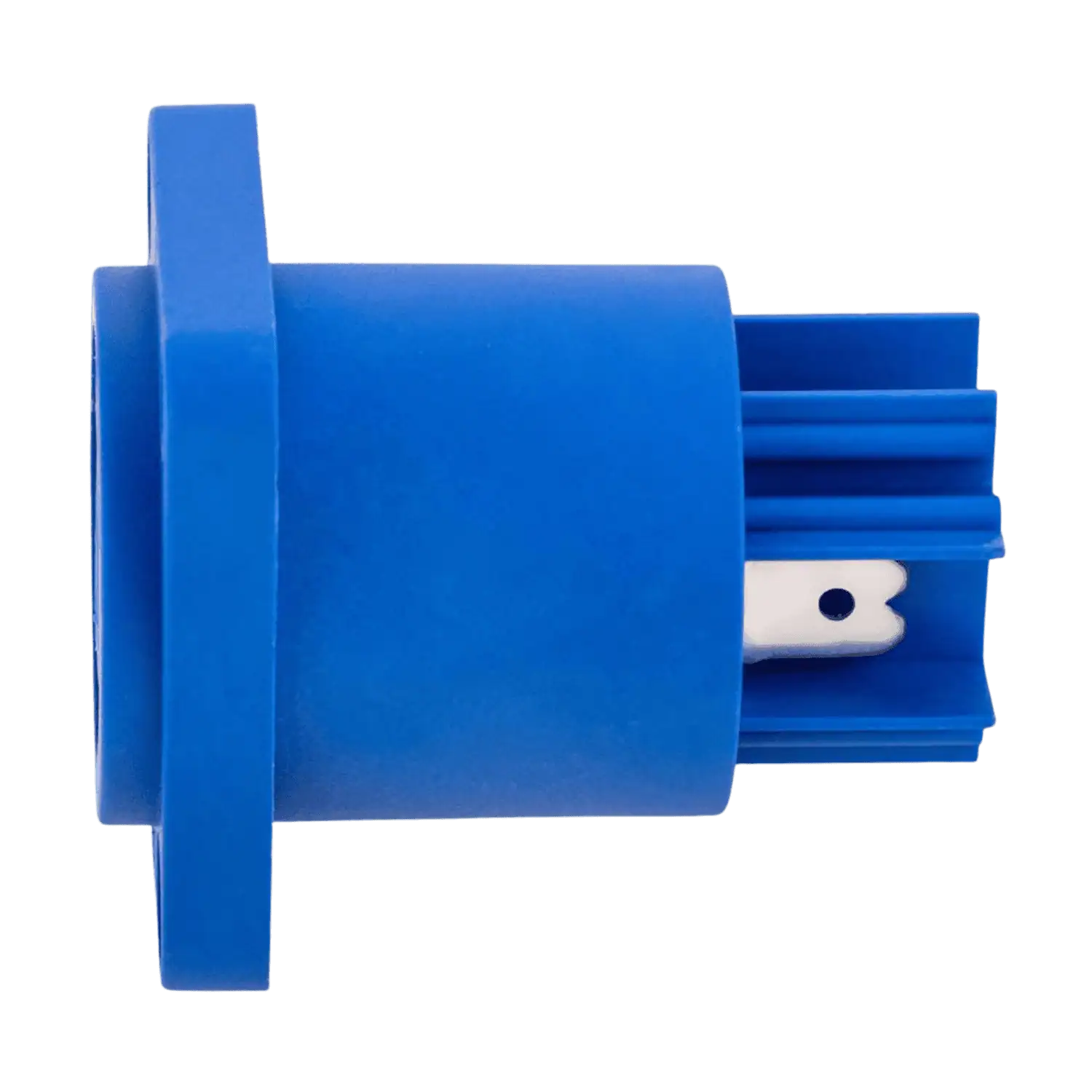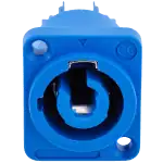 Connettore powercon blu da pannello, può essere montato su pannelli o dispositivi. Il connettore blu viene utilizzato per l’ingresso dell’alimentazione e supporta un amperaggio di massimo 16A. Il connettore è realizzato con plastiche solide e durature e con un sistema di blocco anti disconnessione.