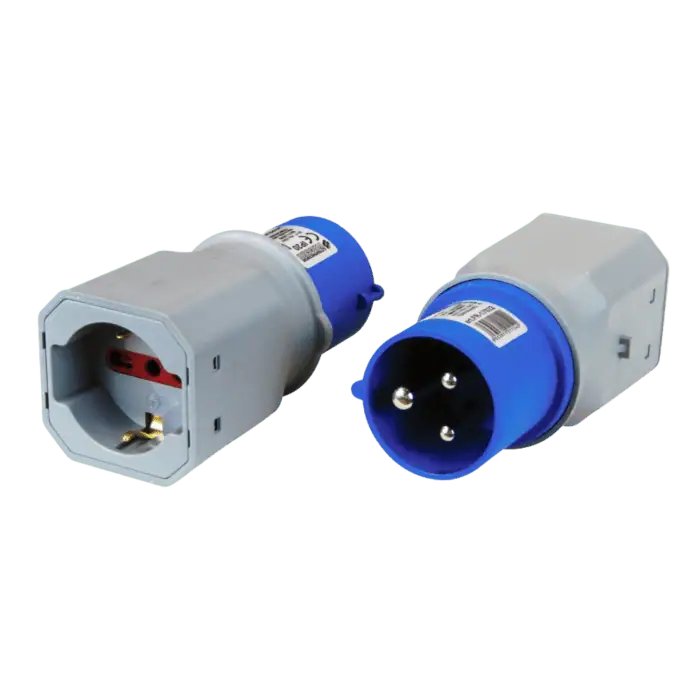 Serie di spine adattatori per utilizzo industriale e domestico, realizzati in materiale resistente e antiurto, creati per far dialogare in tutta sicurezza le connessioni CEE con quelle domestiche. Per uso temporaneo, rimuovere l’adattatore dalla presa dopo l’utilizzo.