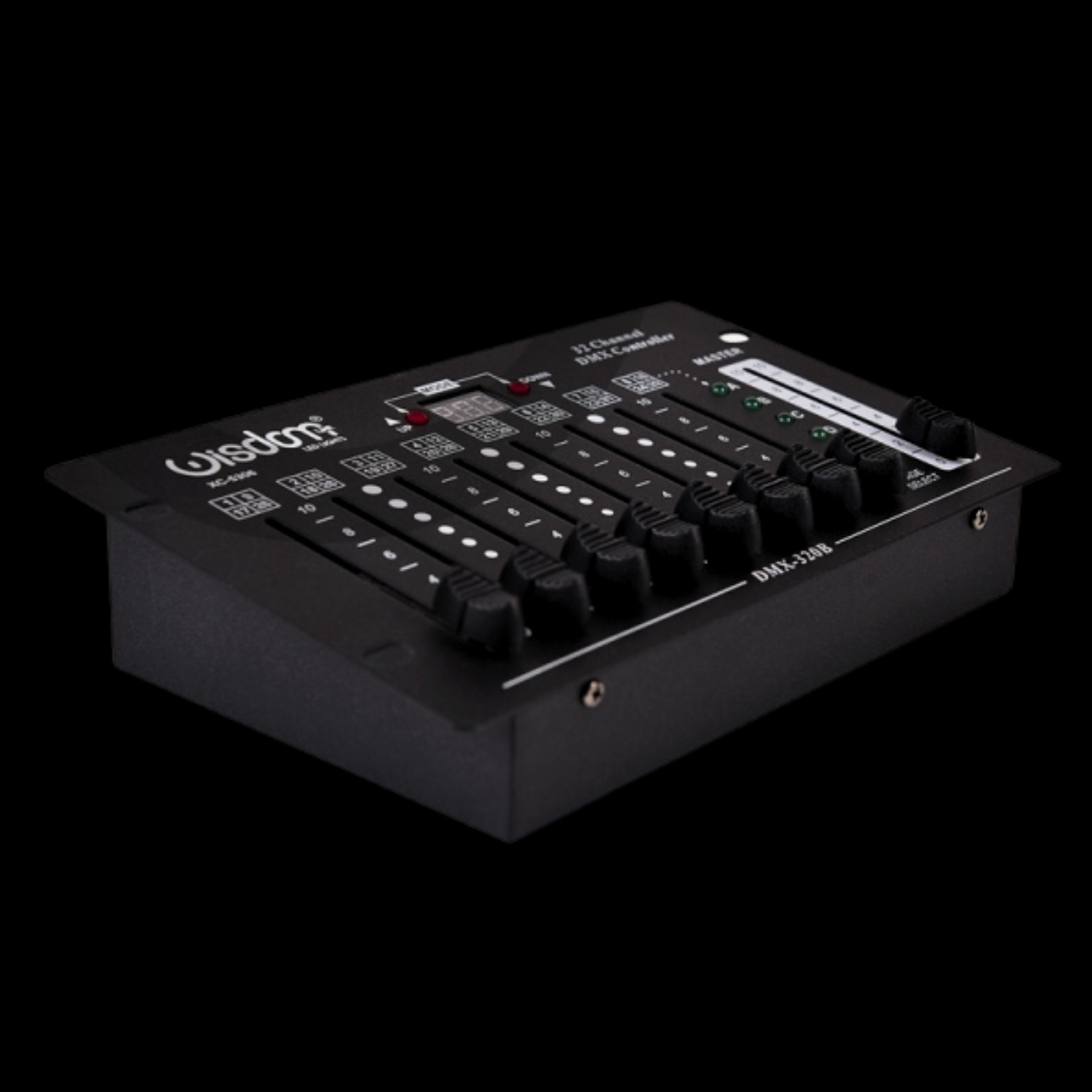 Centralina DMX portatile WISDOM XC-5306 con batteria integrata 9V, 32 canali DMX e display LED. Controller luci compatto ideale per DJ, eventi e teste mobili.