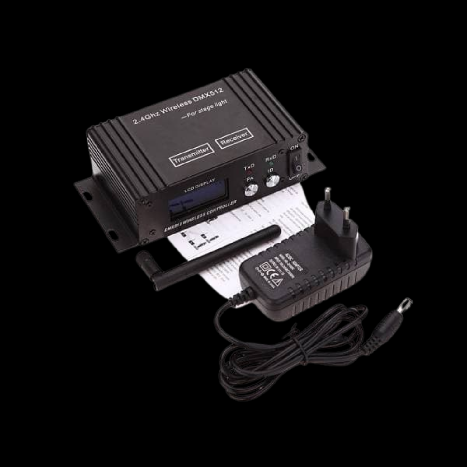 wireless dmx controller trasmettitore e ricevitore professionale con portata fino a 400 metri, trasmissione stabile senza latenza e 16 gruppi ID per controllo luci DMX senza cavi.