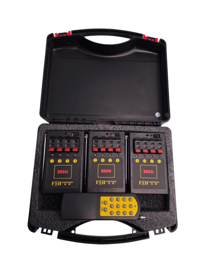 Il Sistema di Accensione Wireless DB04R rappresenta una soluzione versatile e affidabile pensata per chi necessita di un firing system pirotecnico completo, facile da usare per il controllo sicuro di spettacoli pirotecnici e fontane fredde. Questo kit include 3 accenditori pirotecnici, un telecomando a distanza programmabile fino a 12 canali con controllo wireless.