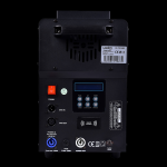 Dal punto di vista del controllo, la Vulkan Fog 1500 offre una grande flessibilità operativa. È dotata di 7 canali DMX, compatibili sia con collegamento cablato sia con DMX wireless, permettendo l’integrazione immediata in qualsiasi regia luci professionale. In alternativa, può essere utilizzata anche in modalità stand-alone grazie al display LCD con 7 pulsanti di controllo, che consente di impostare timer automatici, emissione manuale, intensità del getto di fumo e colori dei LED in modo semplice e intuitivo.