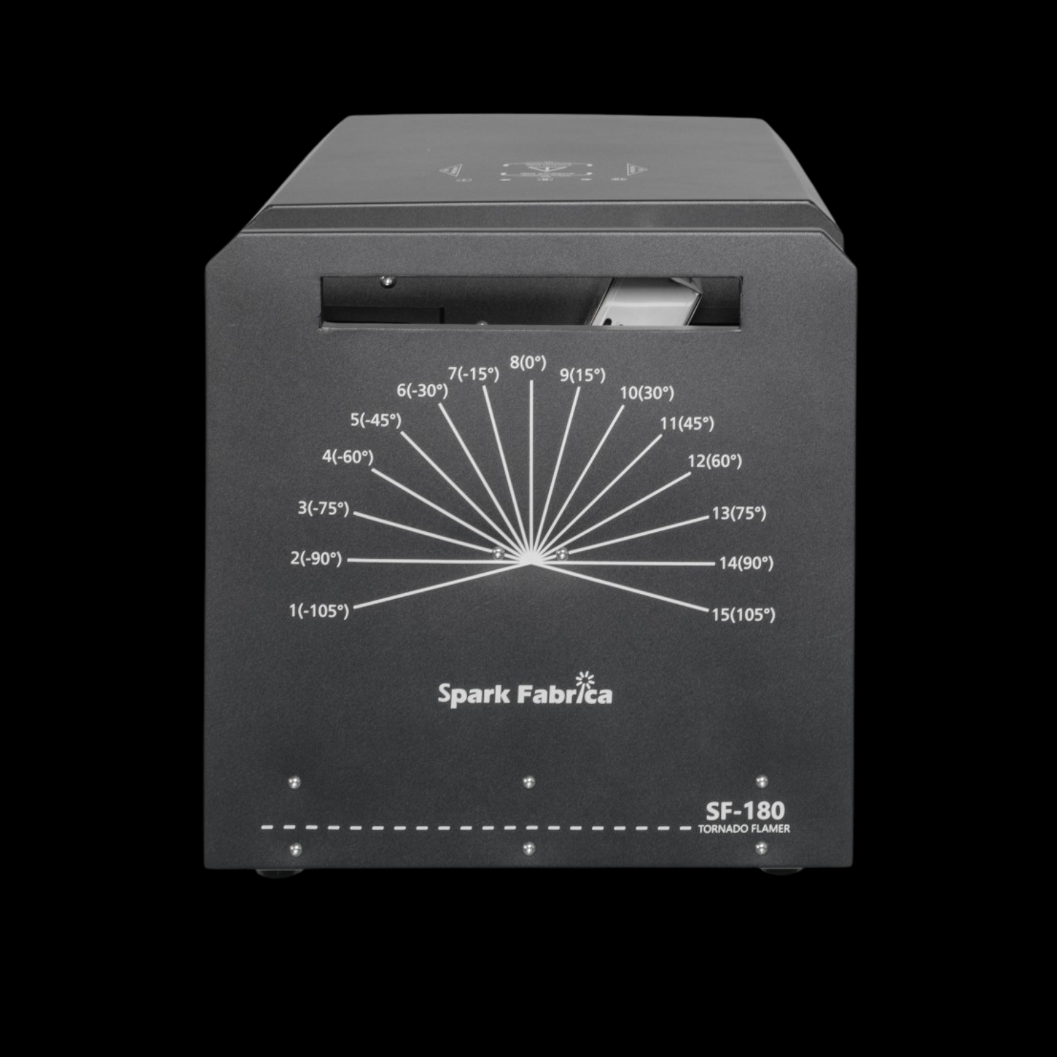 Tornado SF-180 Spark Fabrica: lanciafiamme verticale fino a 10 m con testa mobile 210°, controllo intelligente e flight case incluso per eventi e spettacoli.