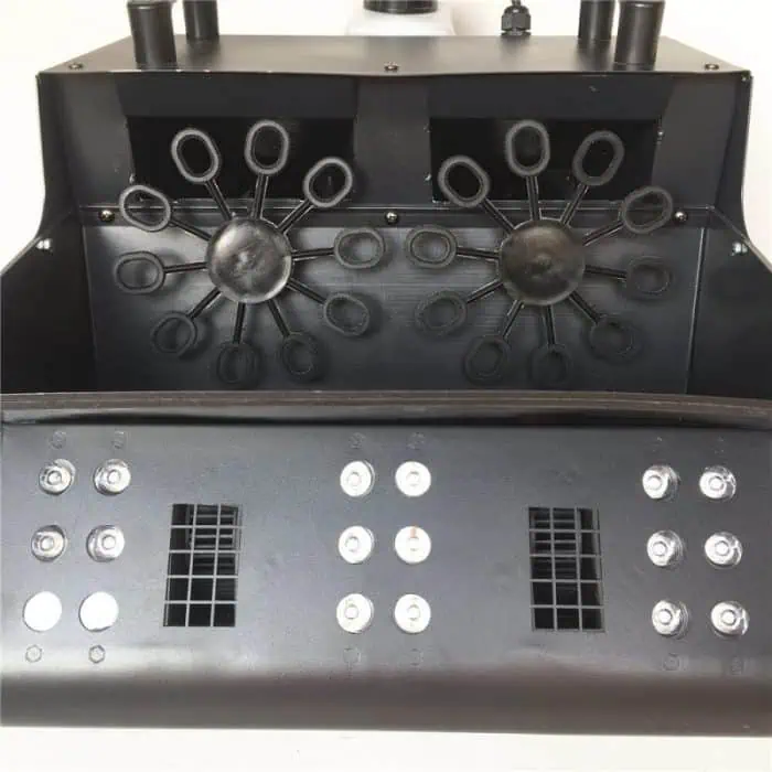 Macchina del fumo e delle bolle insieme: 18 LED da 3W dai colori potenti Rosso, Verde e Blu. La MFB è facile da caricare, facile da usare e facile da pulire grazie al sistema con valvola di drenaggio del liquido, serbatoio da 1,35 lt