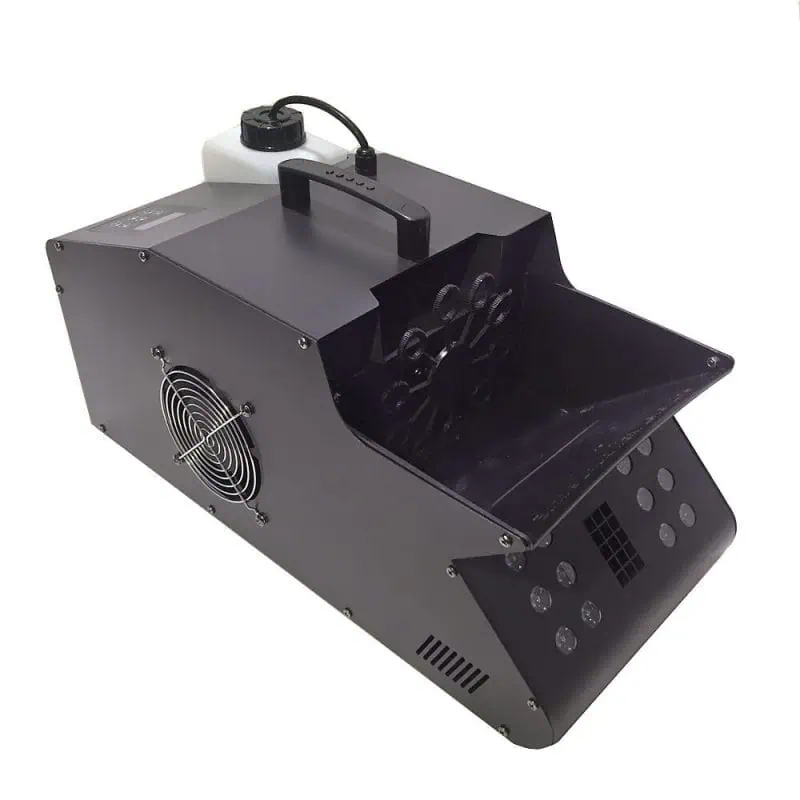 La macchina fumo bolle combina fumo, bolle e LED 3-in-1 all’interno di una sola unità. La doppia ventola della macchina crea ogni minuto numerose bolle riempite con del fumo, creando allo stesso tempo una corrente ascendente che spinge le bolle verso l’alto. Questo sistema è dotato di 18 LED da 3W dai colori potenti: rosso, verde e blu. La MFB è facile da caricare, facile da usare e facile da pulire grazie al sistema con valvola di drenaggio del liquido. La MFB è dotata di doppia maniglia e di ruote integrate per un facile trasporto. Compatibile con la maggior parte dei tipi di liquido per bolle, la MFB è in grado di offrire uno show con le bolle soddisfacente e della qualità più elevata.