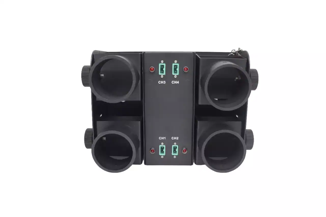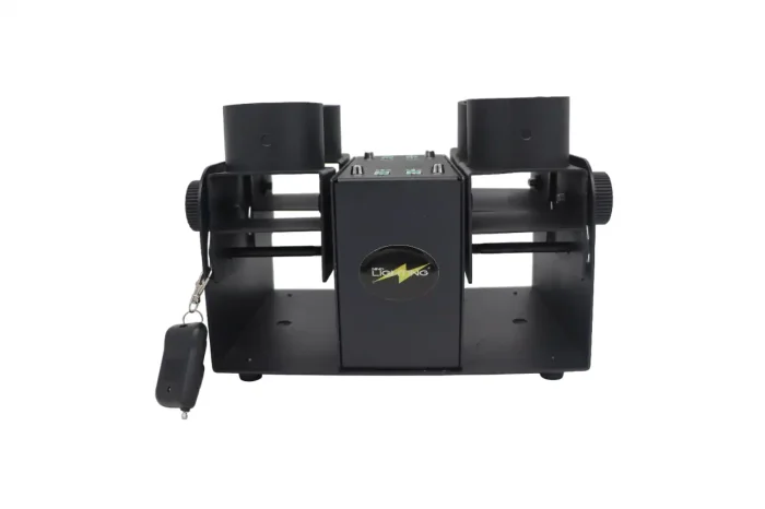 Macchina elettrica per l’azionamento di 4 tubi sparacoriandoli elettrici, attivabili singolarmente o contemporaneamente, tramite telecomando o DMX. La praticità di caricamento e posizionamento dei tubi sparacoriandoli, uniti alla versatilità di controllo, conferiscono a questo dispositivo stabilità nell’uso ed affidabilità nel tempo. Il telecomando è dotato di 4 pulsanti per l’attivazione dei 4 singoli canali in e 1 pulsante per l’attivazione simultanea. È sempre la scelta migliore anche se si tratta di un grande evento all’aperto o di un piccolo matrimonio.