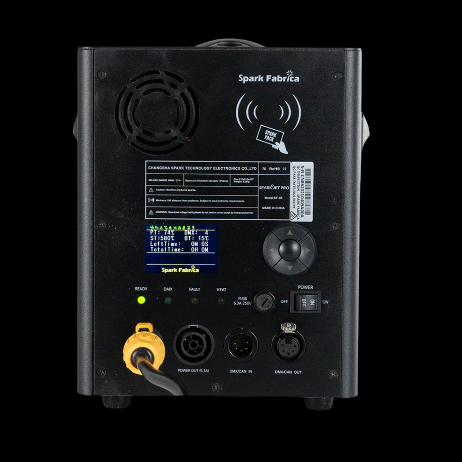 Spark Fabrica SF-05 Jet Pro: scintille fredde sicure da 1,5–5 m per concerti, matrimoni, feste e coreografie. Display TFT e Fly Case incluso.