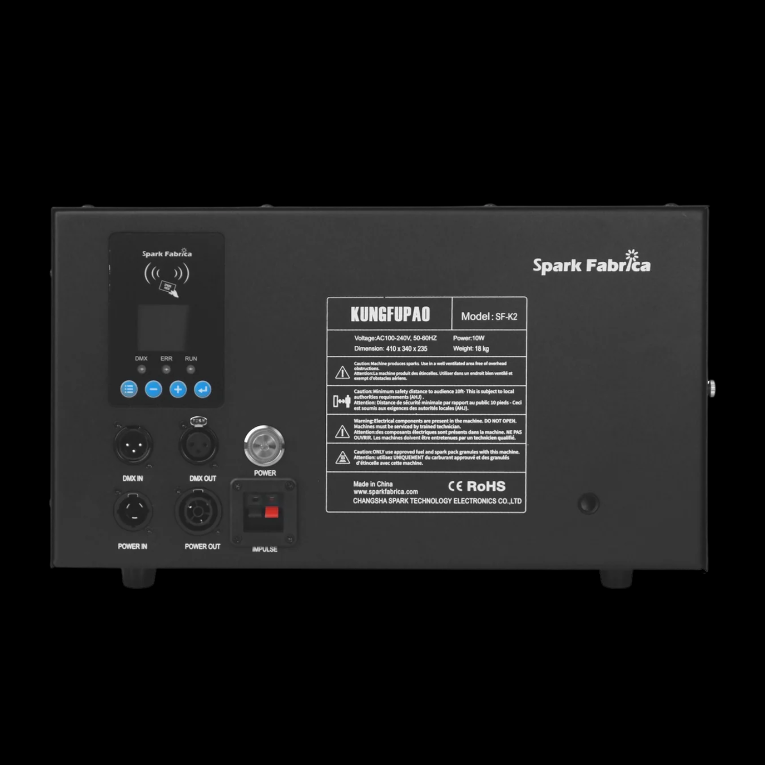 La Spark Fabrica SF-K2 è la soluzione professionale ideale per chi desidera creare effetti scenici spettacolari in totale sicurezza. Questa macchina per scintille fredde genera fontane luminose simili a fuochi d’artificio, senza alcuna fiamma, esplosione o rischio di incendio. Grazie all’utilizzo di una speciale lega di titanio e zirconio, in polvere granulare, ogni effetto è completamente sicuro e rispettoso dell’ambiente. Ogni bustina di polvere Spark Fabrica, acquistabile comodamente sul nostro sito, contiene 200 grammi di materiale pronto all’uso, sufficiente per una durata variabile dai dieci ai venti minuti a seconda dell’altezza selezionata del getto di scintille.