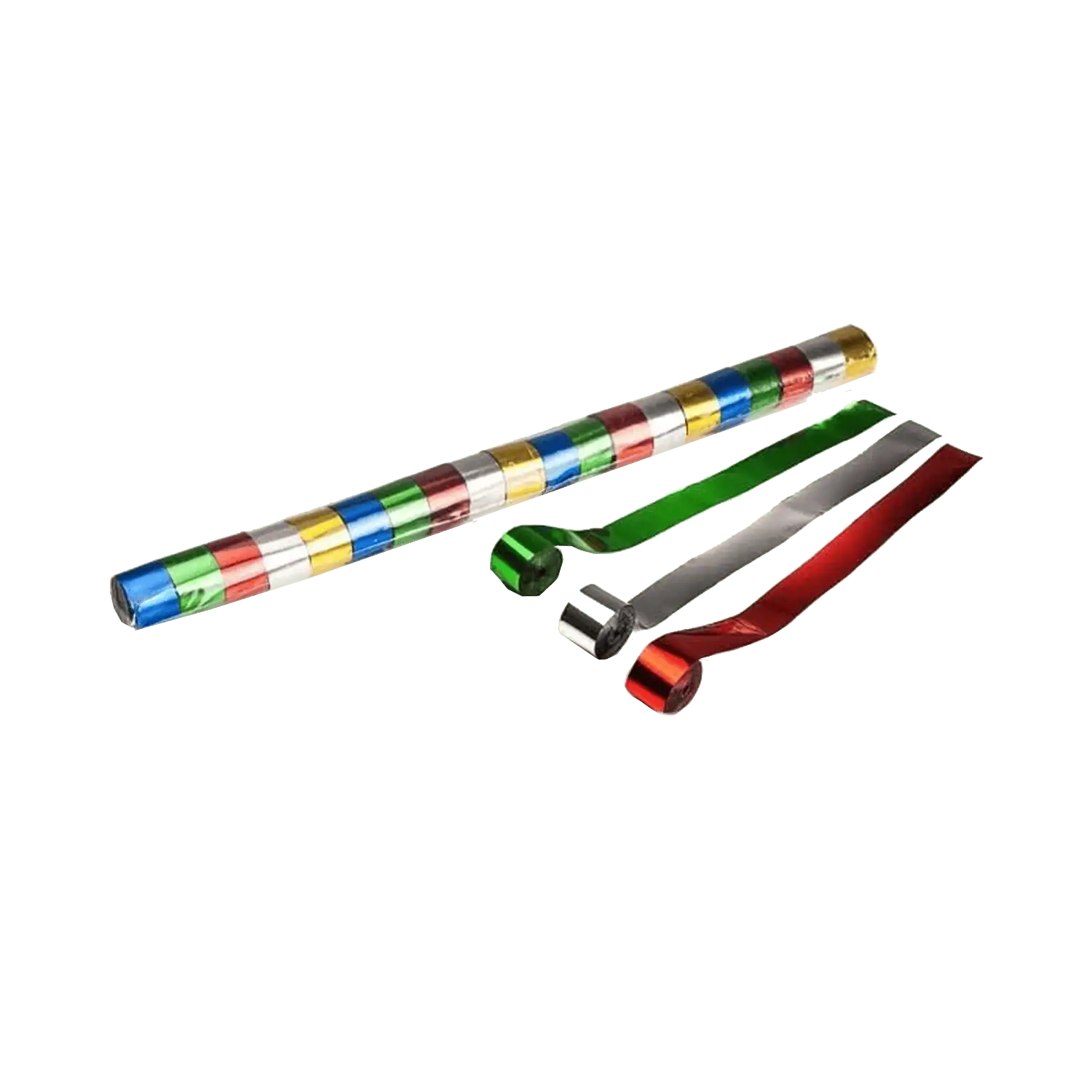 Stelle filanti multicolore metallizzato. Le stelle filanti sono realizzate in materiale PVC  carta ignifuga, un materiale resistente al fuoco che le rende sicure anche in ambienti dove potrebbero esserci rischi legati alla presenza di fiamme o calore. Ogni tubo di stella filante è lunga 5 metri perfetta per creare un effetto visivo ampio e dinamico. Ogni stella filante ha una larghezza di 2cm. Le stelle filanti vengono vendute in sacchetto da 24 unità garantendo una fornitura abbondante per eventi di grande portata. Il multicolore metallizzato aggiunge un tocco elegante e scintillante per spettacoli sia all’aperto che al chiuso. Le stelle filanti sono perfette per essere utilizzate con macchine spara coriandoli e tubi spara coriandoli vuoti. Le stelle filanti multicolore metallizzate sono un’opzione eccellente per creare un’atmosfera vibrante e indimenticabile in qualsiasi grande evento!