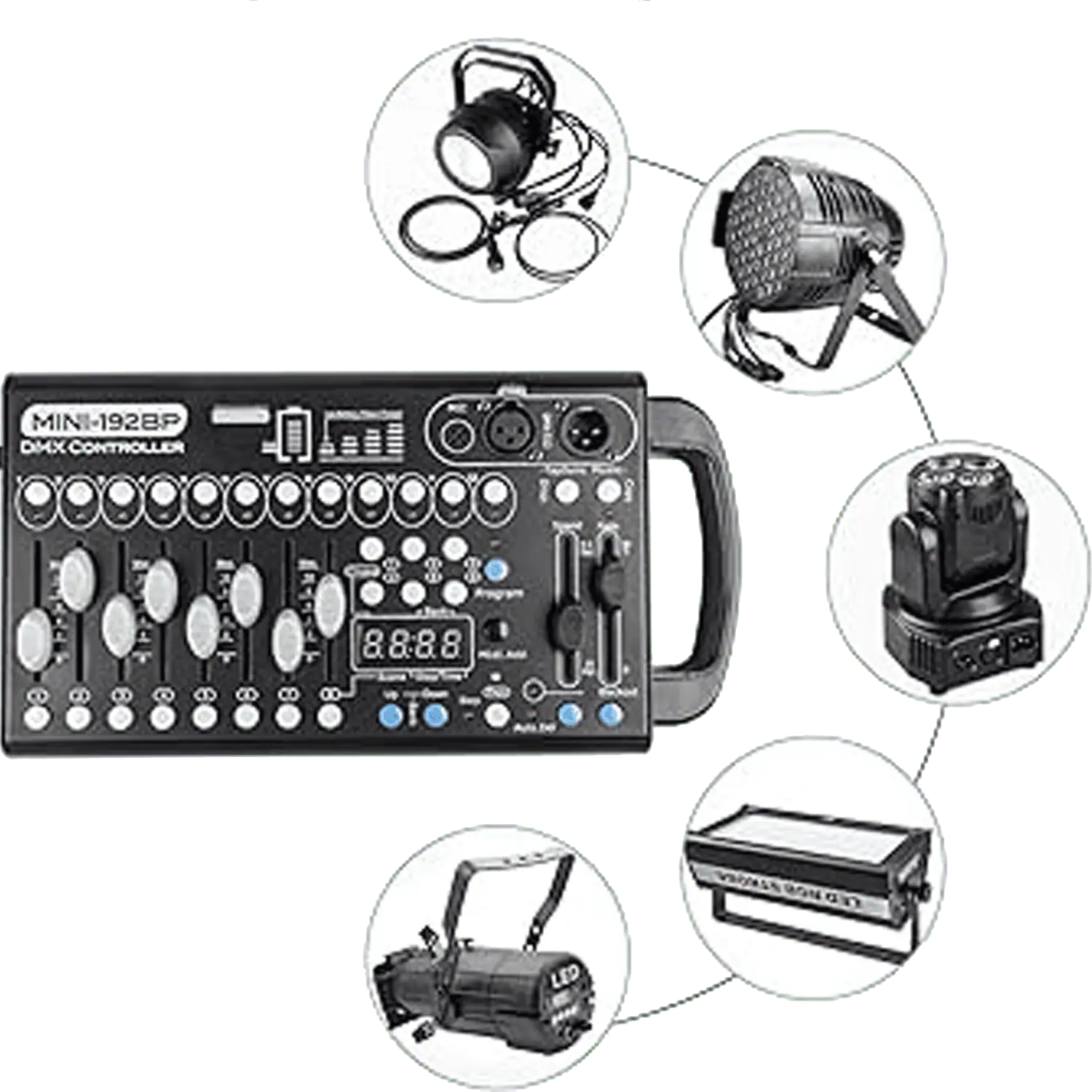 Mini Console DMX per illuminazione da palcoscenico compatibile con tutte le Teste mobili, Par e smart bat  con cavo DMX a 3 pin.
