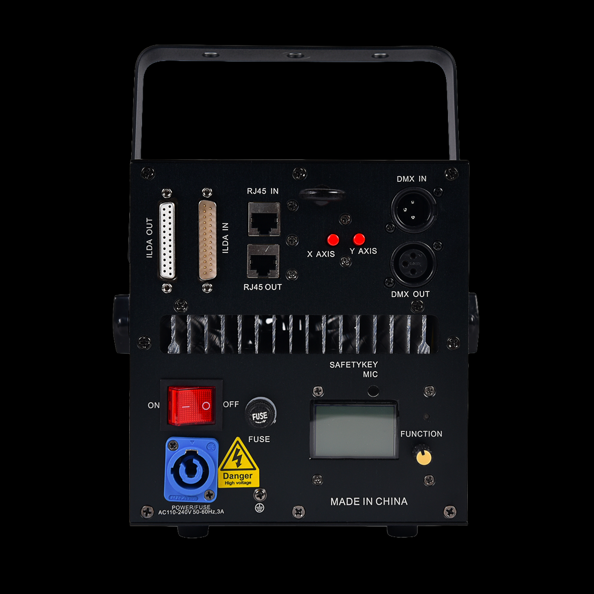 Le dimensioni compatte di 25 × 29 × 20 cm e il peso di 5 kg rendono il laser facilmente trasportabile e installabile, mentre la centralina DMX dal peso di 3 kg completa un sistema professionale pronto all’uso.