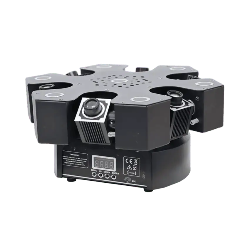La versatilità della Testa Mobile Laser + LED 2W è uno dei suoi punti di forza. È compatibile con i protocolli DMX512, permettendo il controllo totale dei parametri tramite console luci professionali e garantendo la massima integrazione con impianti già esistenti. La connessione ILDA consente invece di pilotare il laser tramite software dedicati, realizzando loghi, scritte, figure geometriche e animazioni personalizzate con un livello di dettaglio elevatissimo. Inoltre, il dispositivo supporta le modalità Master-Slave, Auto e Sound-Activated, offrendo soluzioni rapide e flessibili per ogni esigenza: dalla sincronizzazione di più unità in serie alla creazione di show automatici, fino alla modalità musicale, dove la testa mobile reagisce ai bassi e al ritmo del brano in riproduzione.