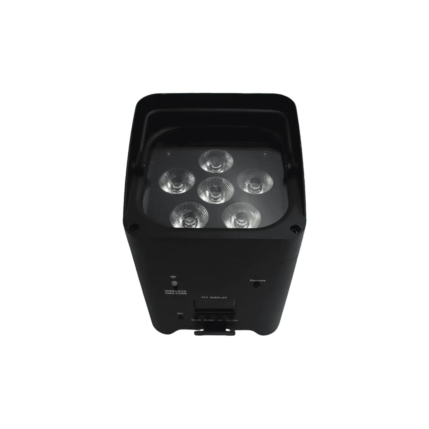 Faretto Smart Bat a batteria ricaricabile con controllo wireless e telecomando, composto da 6 luci LED RGBWAUV da 18W ciascuna. Solida struttura in alluminio e design moderno. Grazie alla sua scocca e alla pratica maniglia, nonché alle ridotte dimensioni, risulta molto robusto e semplice da trasportare. Nella parte inferiore si trova una staffa inclinabile per poter orientare il faretto una volta posizionato a pavimento. Controllo tramite Wi-Fi (smartphone e tablet), DMX512 (wireless e cablato), oppure funzionamento in automatico o musicale. Tramite il DMX e direttamente dal display a LED da 2” è possibile controllare: luminosità complessiva, luminosità singoli colori, strobo, macro.