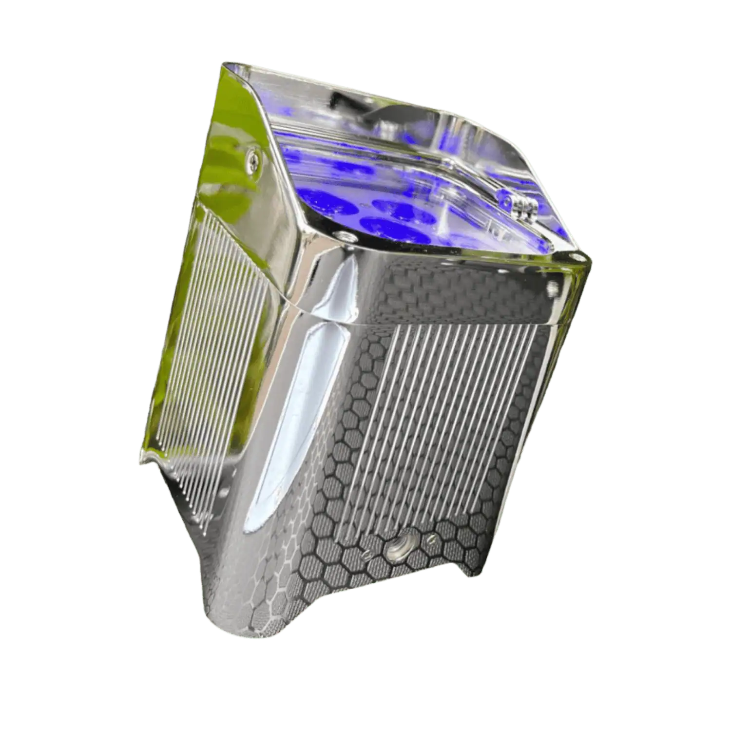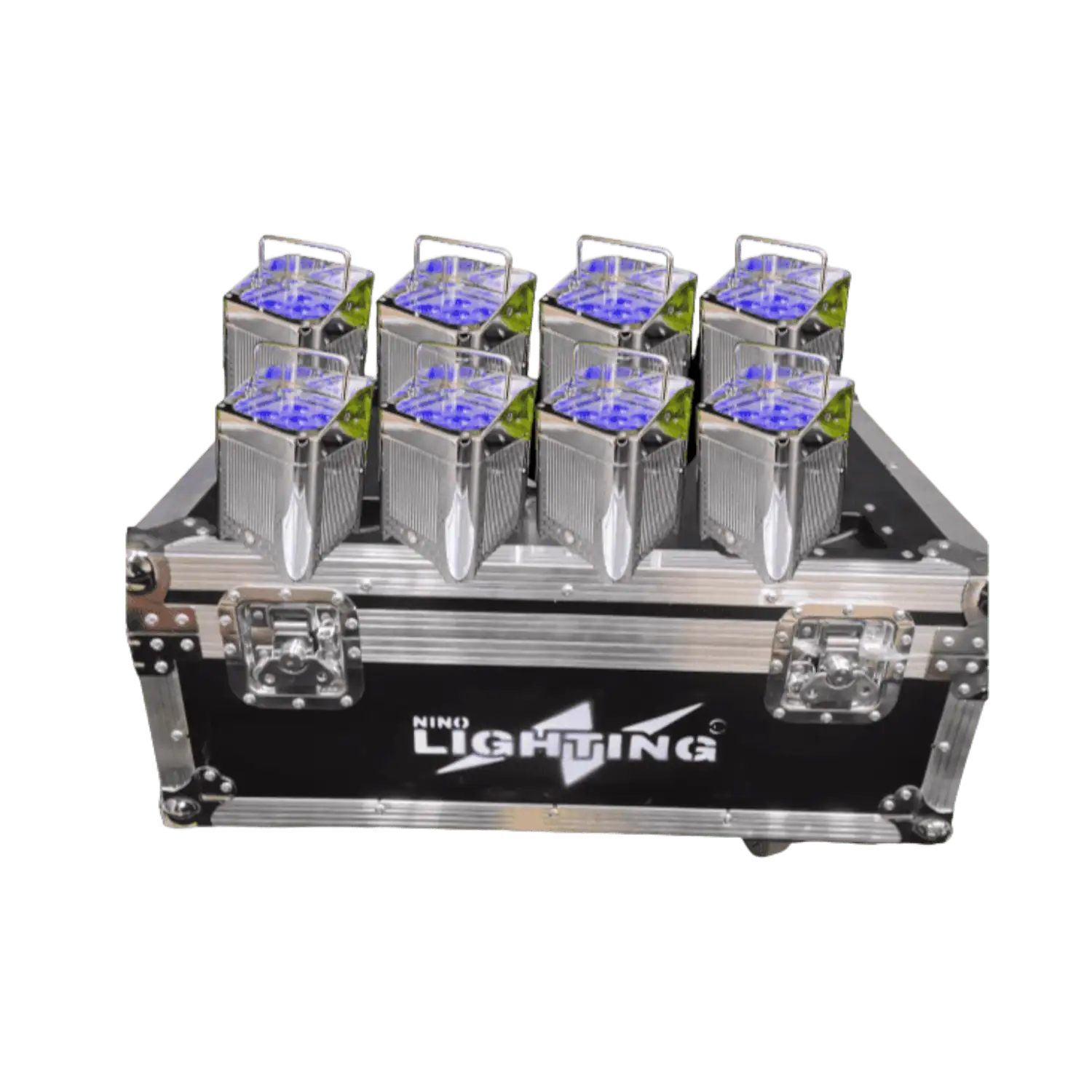 Fly Case da 8 Smart Batt PAR LED Cromati a batteria ricaricabile con controllo wireless e telecomando, composti da 6 luci LED RGBWA-UV 6 in 1 da 18W