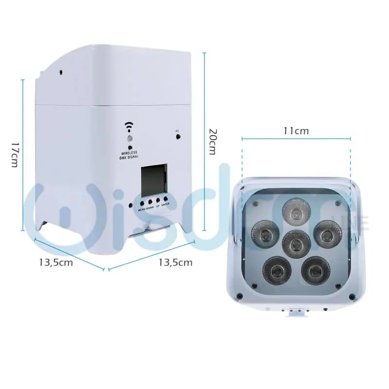 Faretto SmartBat senza fili a batteria ricaricabile con controllo wireless e telecomando, composto da 6 luci LED RGBWAUV da 18W ciascuna. Solida struttura in alluminio e design moderno. Grazie alla sua scocca e alla pratica maniglia, nonché alle ridotte dimensioni, risulta molto robusto e semplice da trasportare. Nella parte inferiore si trova una staffa inclinabile per poter orientare il faretto una volta posizionato a pavimento. Controllo tramite Wi-Fi (smartphone e tablet), DMX512 (wireless e cablato), oppure funzionamento in automatico o musicale. Tramite il DMX e direttamente dal display a led da 2” è possibile controllare: luminosità complessiva, luminosità singoli colori, strobo, macro.