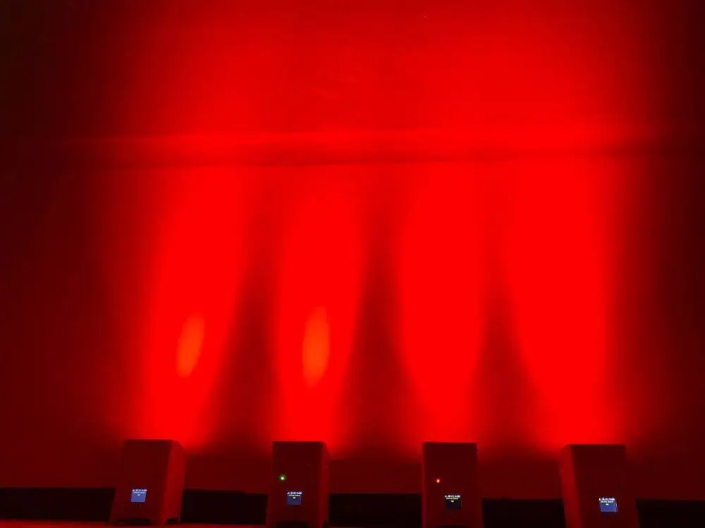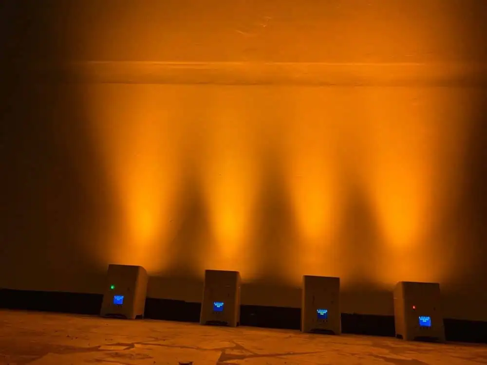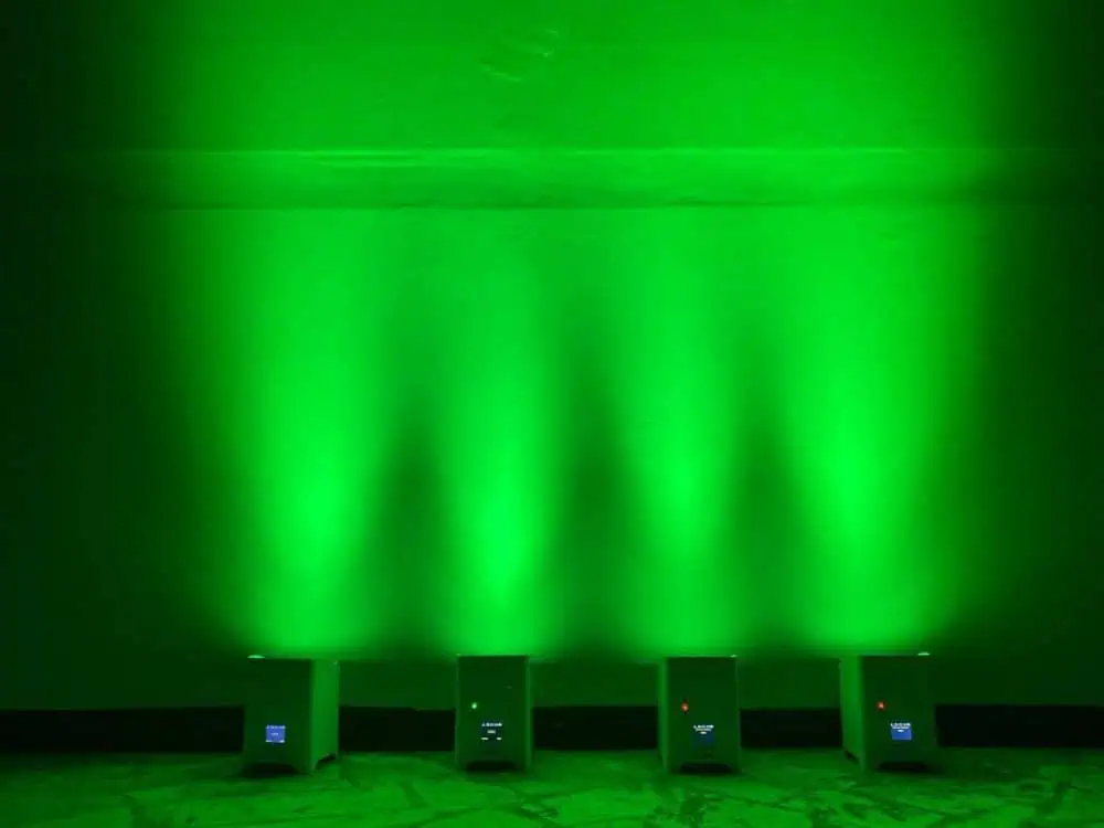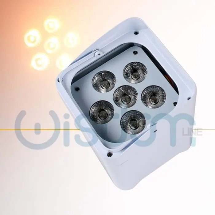 Faretto PAR LED Smart Battery (a batteria ricaricabile) con controllo wireless WiFi e telecomando, composto da 6 luci led RGBWAUV 6 in 1 da 18W ciascuna, solida struttura in alluminio e design moderno, ideale per luci uplight di effetto dj e architetturali in discoteca, concerti, spettacoli e matrimoni