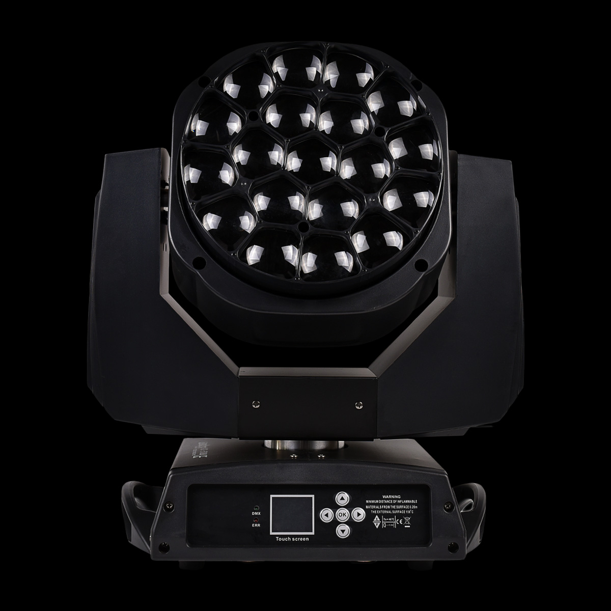 Testa Mobile Wash Zoom 19×15 RGBW: LED ad alta potenza, zoom 4°-60°, controllo DMX, movimenti 540°/270°, dimmer e strobo professionali. Perfetta per spettacoli, eventi, concerti e installazioni luminose