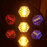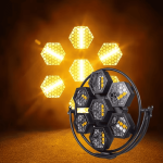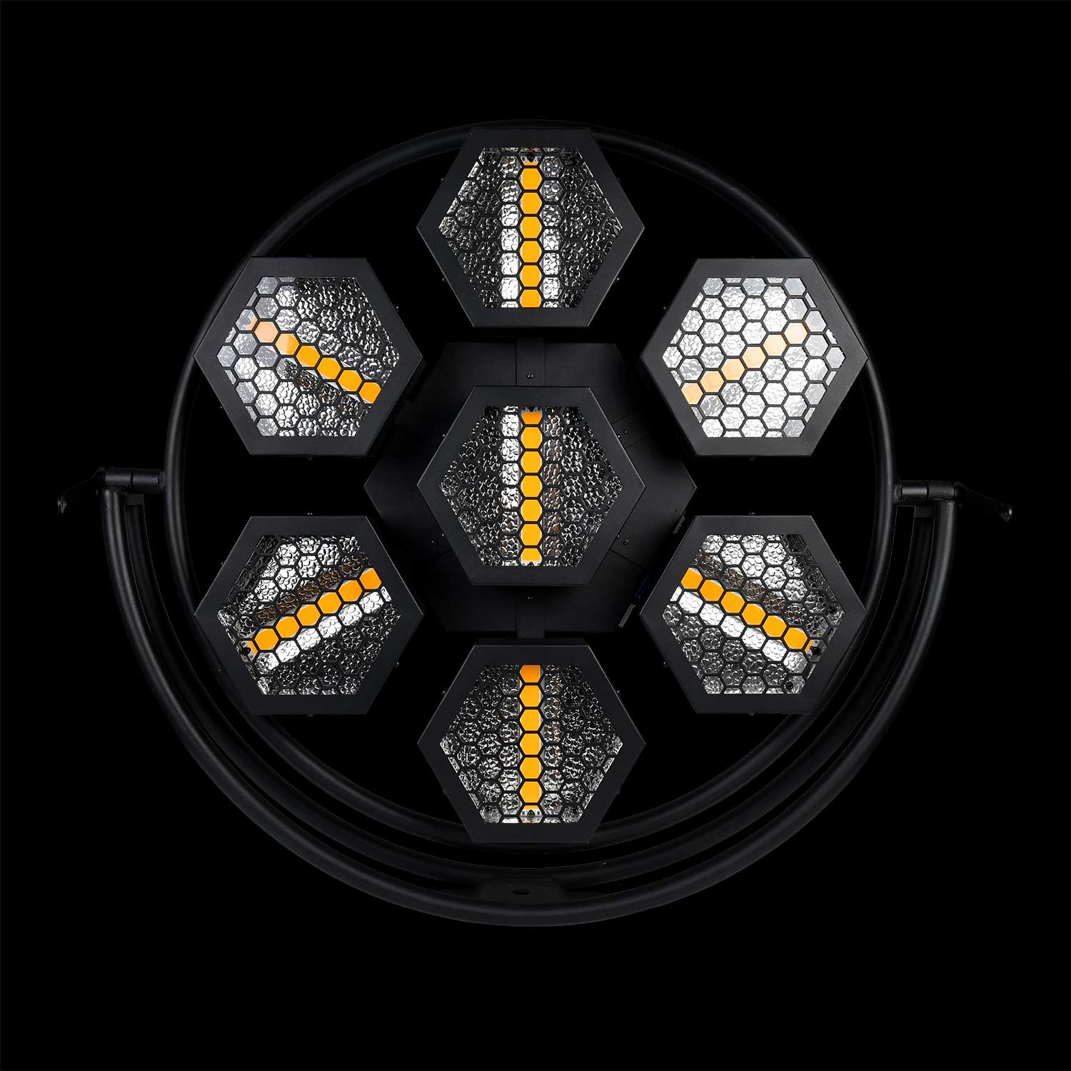 Il design vintage retrò del Mini Port Flower cattura immediatamente l’attenzione grazie alla sua forma circolare e ai sette moduli LED esagonali disposti in una struttura a nido d’ape. Questa configurazione geometrica non solo è esteticamente accattivante, ma assicura una distribuzione uniforme della luce, creando un impatto visivo scenografico. Ogni esagono è dotato di illuminatori RGB e di una sorgente COB con luce calda da 2700K, pensata per riprodurre l’intensità e la morbidezza delle lampade alogene tradizionali, offrendo allo stesso tempo la versatilità cromatica dei LED moderni. Il risultato è una luce potente, dinamica e naturale, capace di adattarsi a qualunque contesto: dai toni caldi e accoglienti per ambientazioni romantiche, alle combinazioni cromatiche vibranti per spettacoli e installazioni artistiche.