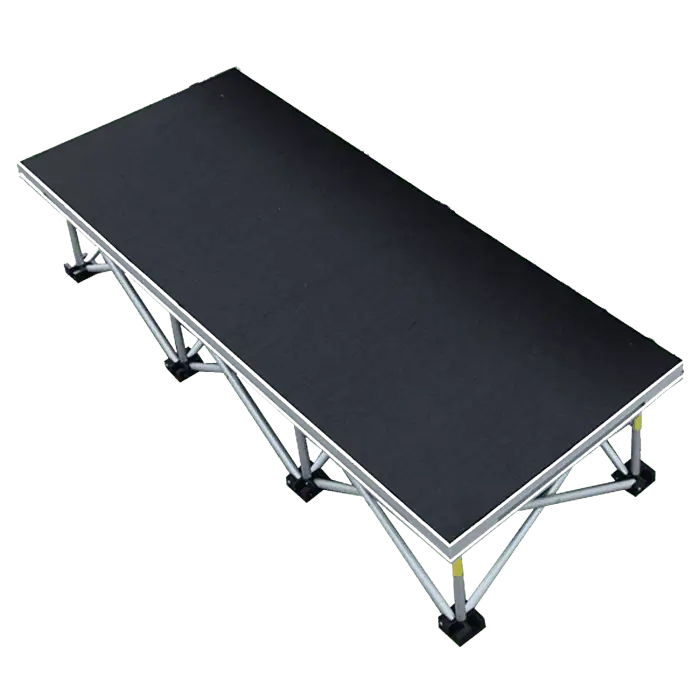 Base telescopica h 40 cm per pedana modulare ZZIPP ZZTM100, riser professionale in alluminio anodizzato con teste di appoggio in nylon, portata 800 kg/m², dimensioni 100×100 cm, richiudibile senza attrezzi, disponibile singolarmente o completa di pedana modulare per palchi