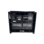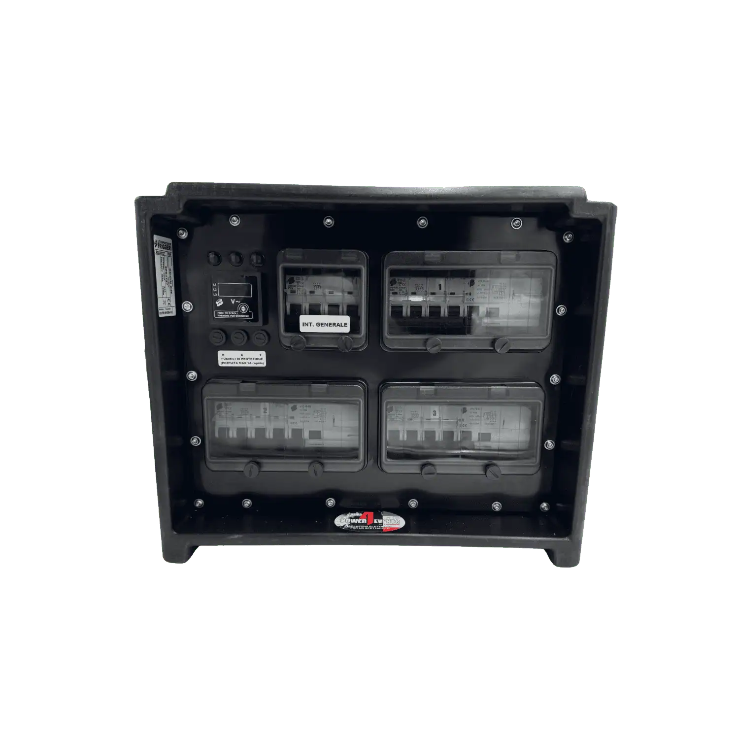 Cassetta in polietilene antiurto in colore nero con maniglie ergonomiche per il trasporto integrate configurazione prese-interruttori fronte/retro. Prese protette individualmente, spie di segnalazione rete LED sulle 3 fasi e voltmetro digitale trifase a pannello