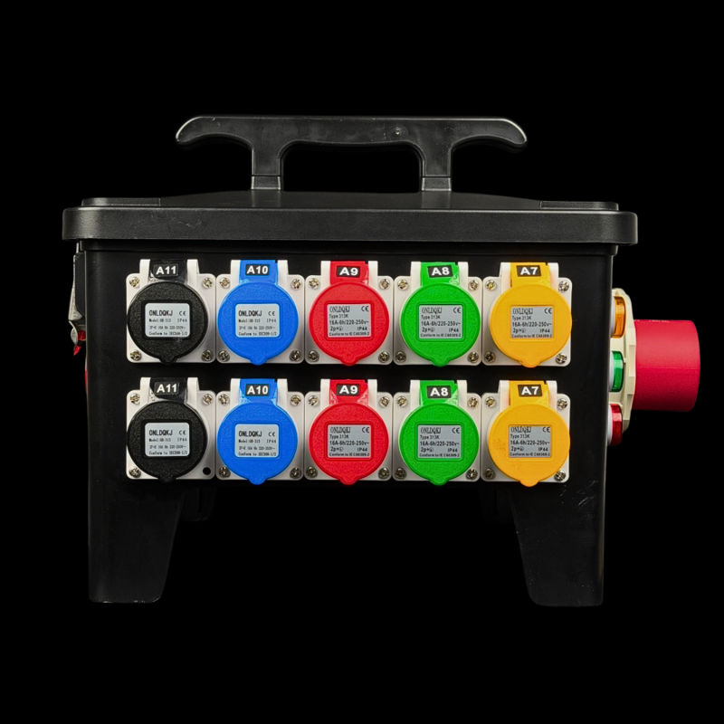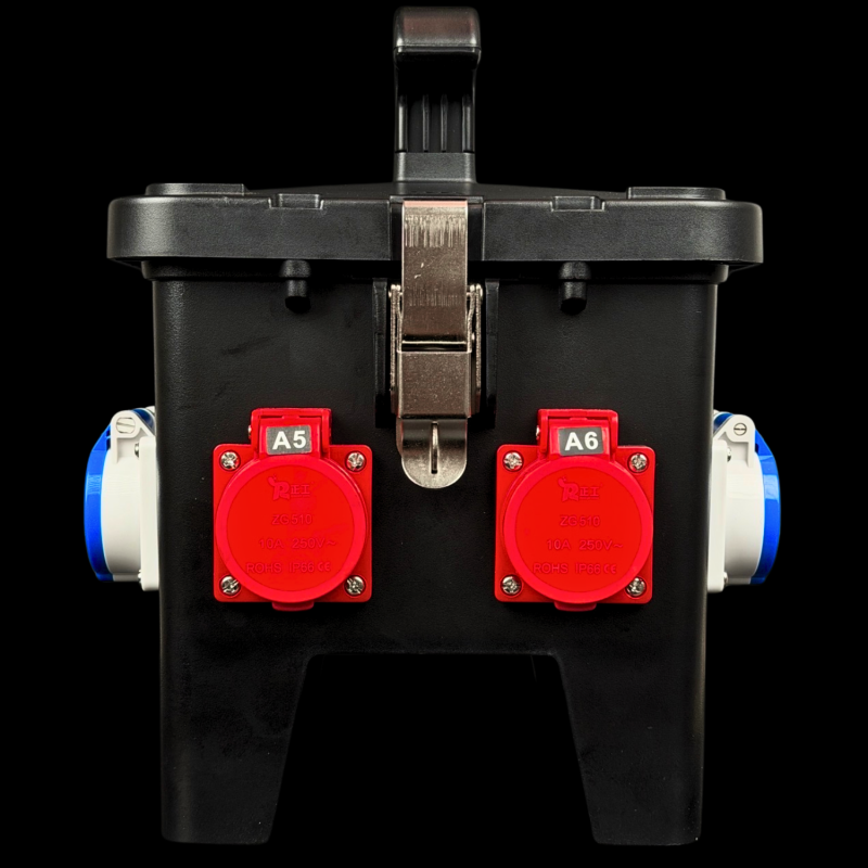 Quadro elettrico portatile in policarbonato antiurto con scatola di distribuzione pratica, robusta e leggera, dotato di maniglia superiore per il trasporto con case impilabile. Vano interruttori con sportellino trasparente, prese protette individualmente. Perfetta ripartizione dei carichi. Ideale per applicazioni live e stage.