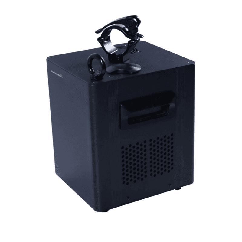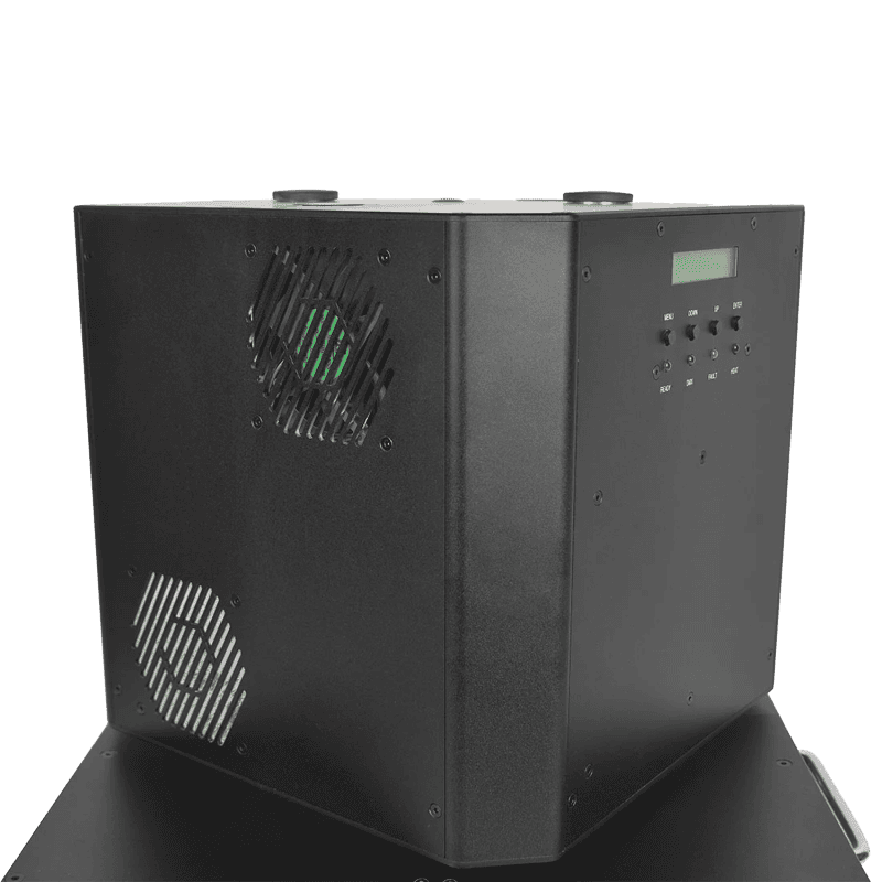 Con un peso di 17 kg e dimensioni compatte (29 × 31 × 31 cm), la macchina è facile da trasportare, installare e integrare in setup scenici professionali, rack da spettacolo e strutture modulari. Le griglie di aerazione ottimizzate garantiscono un raffreddamento efficace e un funzionamento stabile anche in condizioni di lavoro intensivo.
