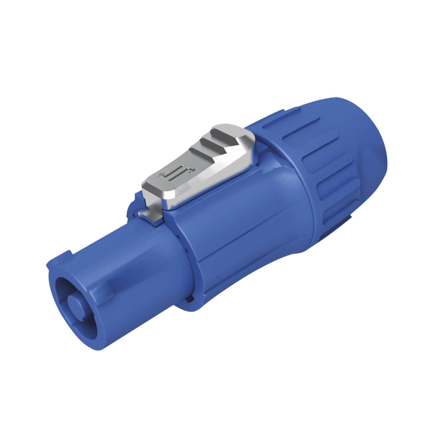 Connettore volante powercon blu, puรฒ essere montato su cavi di qualsiasi tipologia, fino a 2,5 mm x 3. Il connettore blu viene utilizzato per lโingresso dellโalimentazione e supporta un amperaggio di massimo di 16A. Il connettore รจ realizzato con plastiche solide e durature e con un sistema di blocco anti disconnessione.
