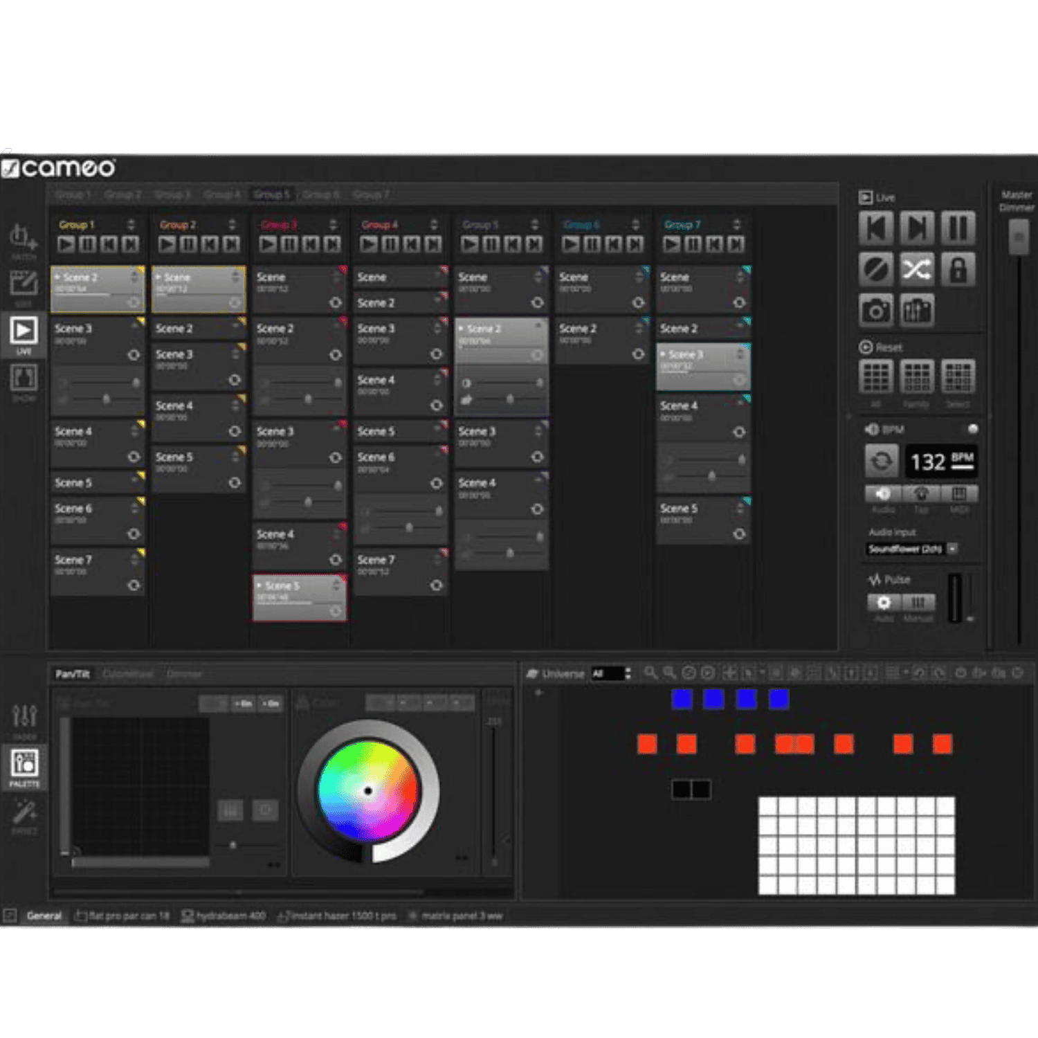 Il software incluso rappresenta uno degli elementi più avanzati del sistema. Compatibile con Cameo D4 e Daslight D4 in versione completa, offre strumenti professionali per la programmazione lighting, tra cui editing live, gestione timeline, effetti automatici e sincronizzazione musicale avanzata. L’analizzatore audio integrato permette di adattare automaticamente gli effetti luminosi al ritmo della musica, mentre il supporto MIDI Clock consente una sincronizzazione precisa tra luce e performance musicali.