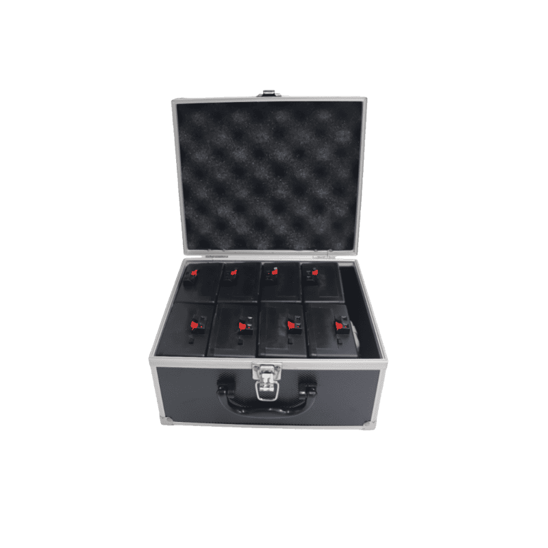 Ogni ricevitore รจ alimentato con 4 batterie AA, mentre il telecomando utilizza 2 batterie mini stilo, offrendo una lunga autonomia inclusa anche la valigetta ideale per il trasporto proteggendo telecomando e ricevitori da urti.