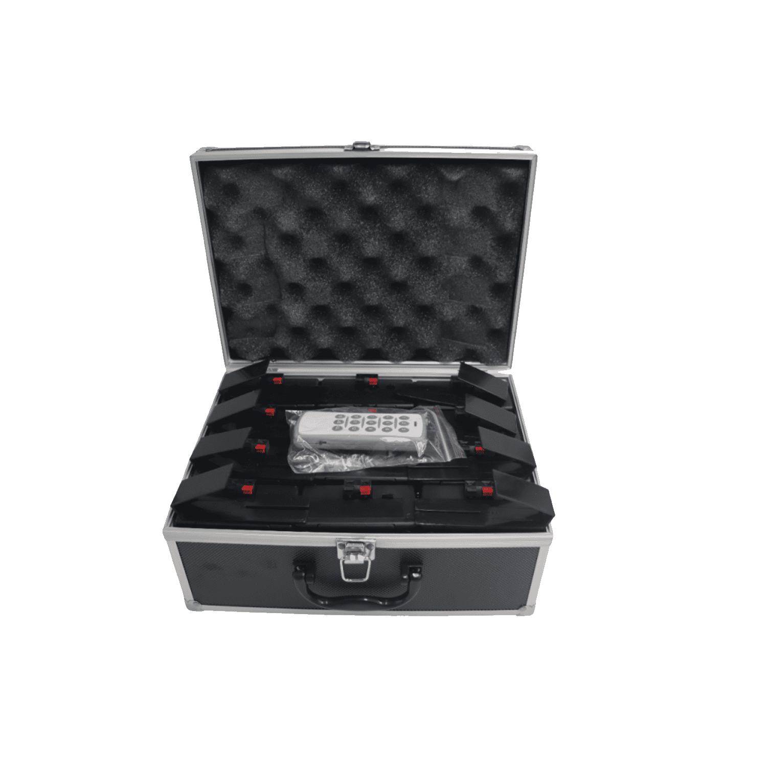 Kit valigetta da 12 pezzi per l’accensione a distanza di fontane fredde e coni , per rendere unica la tua festa e la tua celebrazione. Usare il nostro kit รจ davvero facile, basterร inserire le fontane nel foro e premere il pulsante del telecomando per mostrare a tutti lo spettacolo! Le fontane vanno inserite nell’apposito foro nella basetta, per un massimo di 12 fontane, mentre per i coni non occorre posizionarli nei fori, basterร posizionarli a terra e collegare l’accenditore con la morsettiera della basetta. Le basi sono suddivise con lettere per facilitare l’ utilizzo del telecomando, dotati di morsettiere, e LED di funzionamento. L’intero set comprende la valigetta, 1 telecomando con 12 ricevitori.