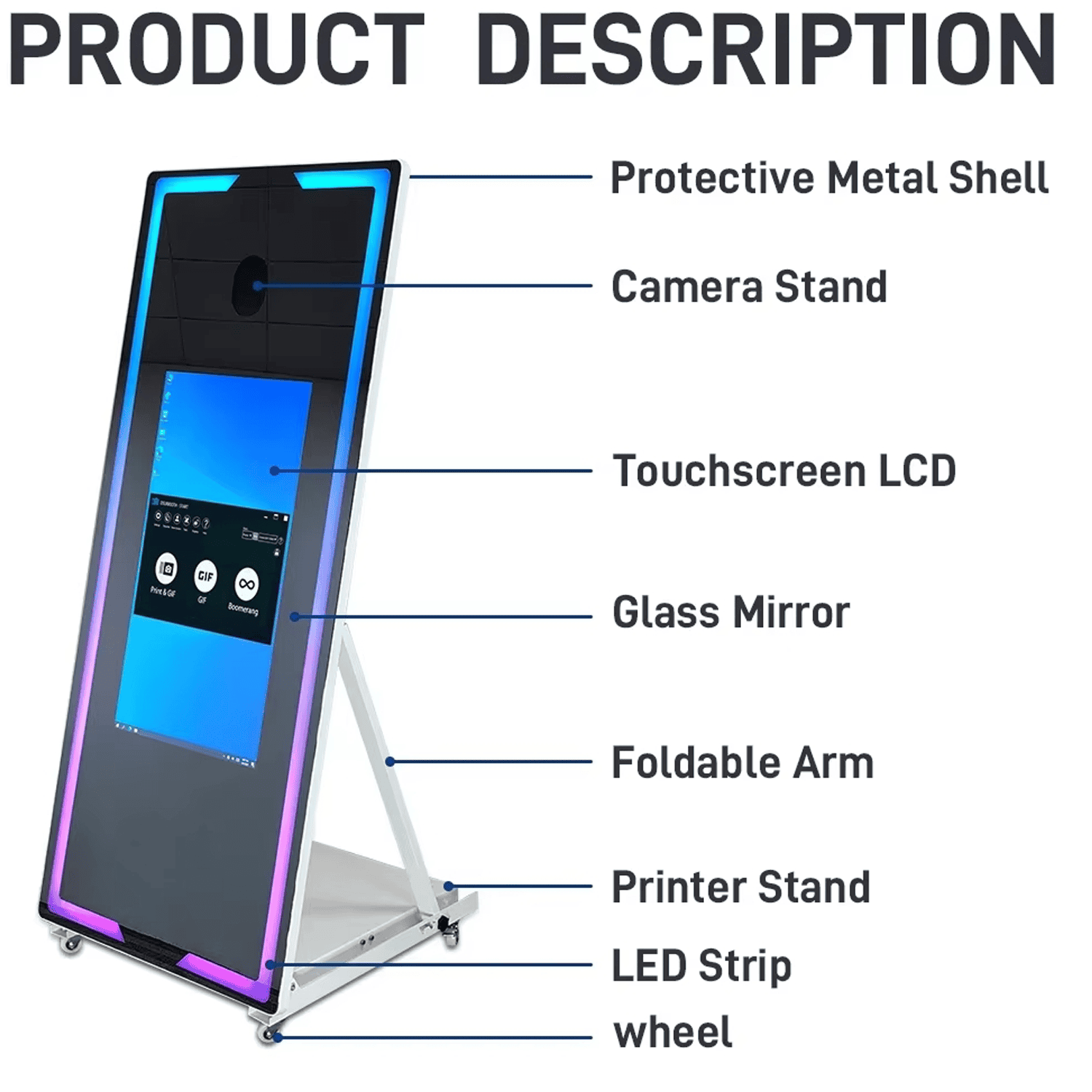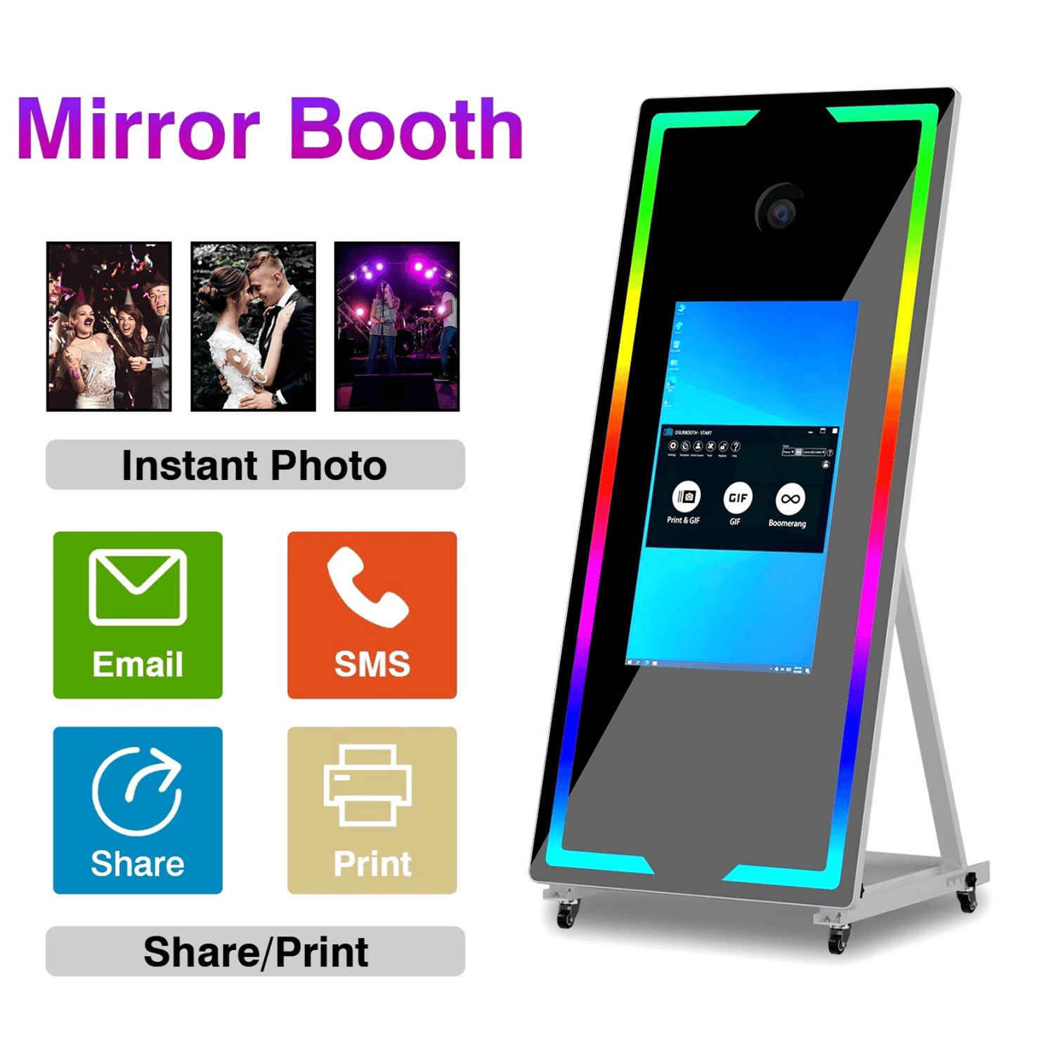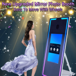 Cabina Fotografica Mirror Photo Booth con rotelle per facile trasporto, Prodotto Esclusivo LAMPOSHOP con specchio magico da 65 pollici con touch screen da 32 pollici Per Scattare Foto Video. Configurata con diverse lingue puรฒ essere collegata a una stampante per stampare foto. Al suo interno del pannello Il mirror Photo Booth ha un mini pc con processore Intel i5 con 8GB di RAM con sistema operativo Windows 10pro. Il software di base รจ DSLRBooth un app capace di stampare foto, gif e boomerang giร installata. La risoluzione del display รจ 1080×1920 Schermo LED HD .