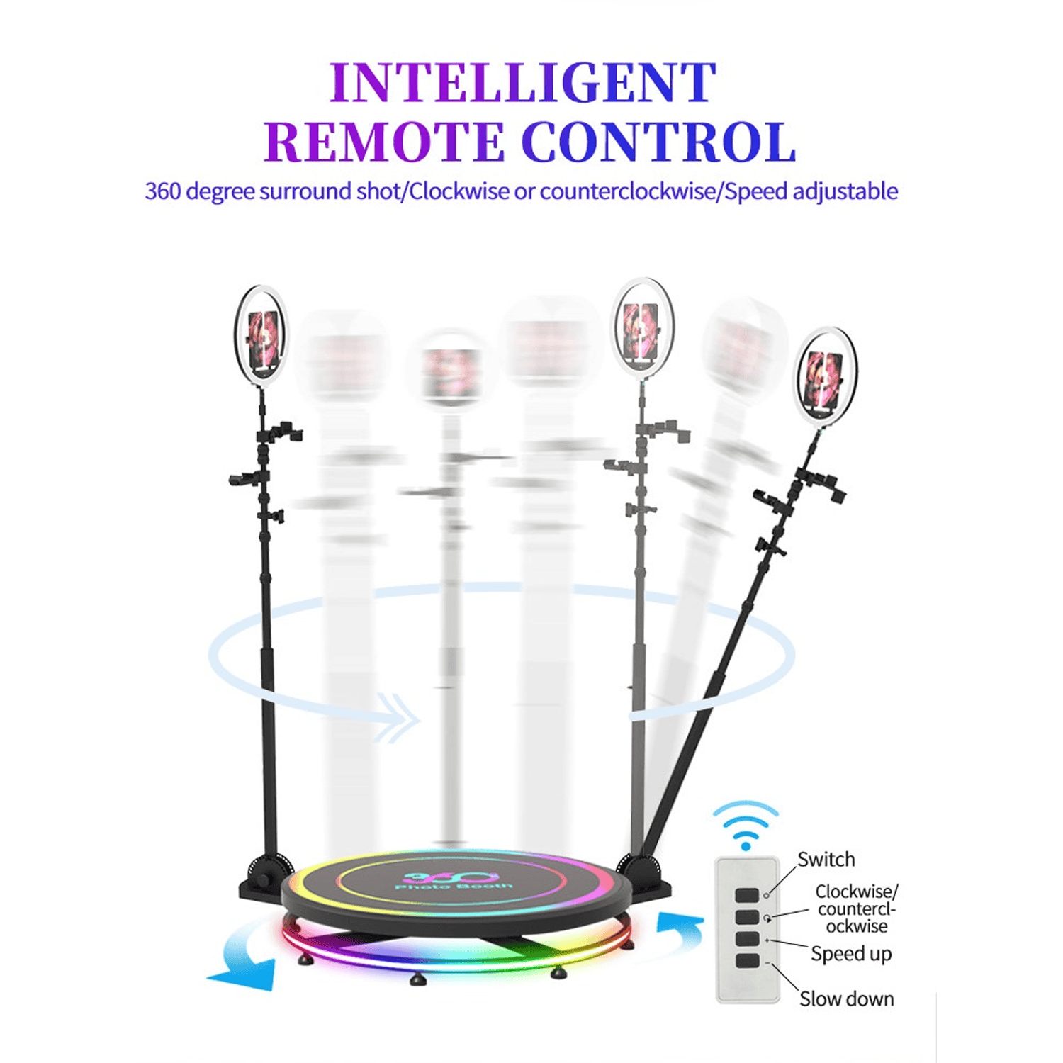 PHOTO BOOTH 360° ROTANTE: Macchina a rotazione continua per foto e video 360° foto boot, per produrre foto e video panoramici in movimento da ogni angolazione. Facile da velocizzare grazie alla rotazione in senso orario/anti orario con il pulsante del telecomando. Col telecomando potrai fare anche altre numerose funzioni tra cui: cambiare il colore del poggia piedi (RGB) e la lampada per i selfie scegliendo il tuo colore preferito! Il nostro PHOTO BOOTH è dotato di più supporti per supportare l’installazione di: Smart Phone, I-Pad, Fotocamere e Tablet. La lunghezza e l’angolo del selfie stick possono essere regolati in base alle tue esigenze. Puoi facilmente registrare i tuoi momenti meravigliosi da tutte le angolazioni, libera il tuo fascino e registra ogni momento indimenticabile. Il nostro PHOTO BOOTH verra compreso di Flight case con lunghezza del poggia piedi di 100 cm, la portata massima del peso è di circa 400 Kg limite massimo consigliabile da 1 a 4persone. Può essere utilizzata per feste, eventi, matrimoni, spettacoli.