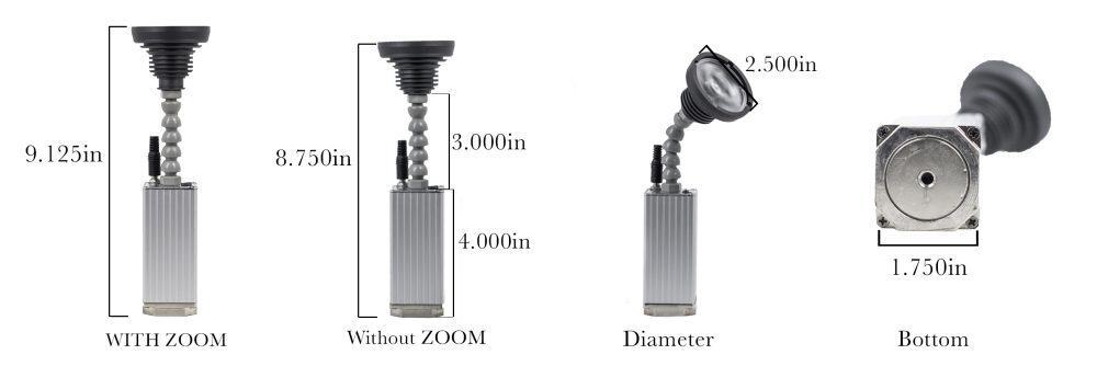 - Materiali: corpo / testa (alluminio anodizzato) collo (plastica pieghevole)