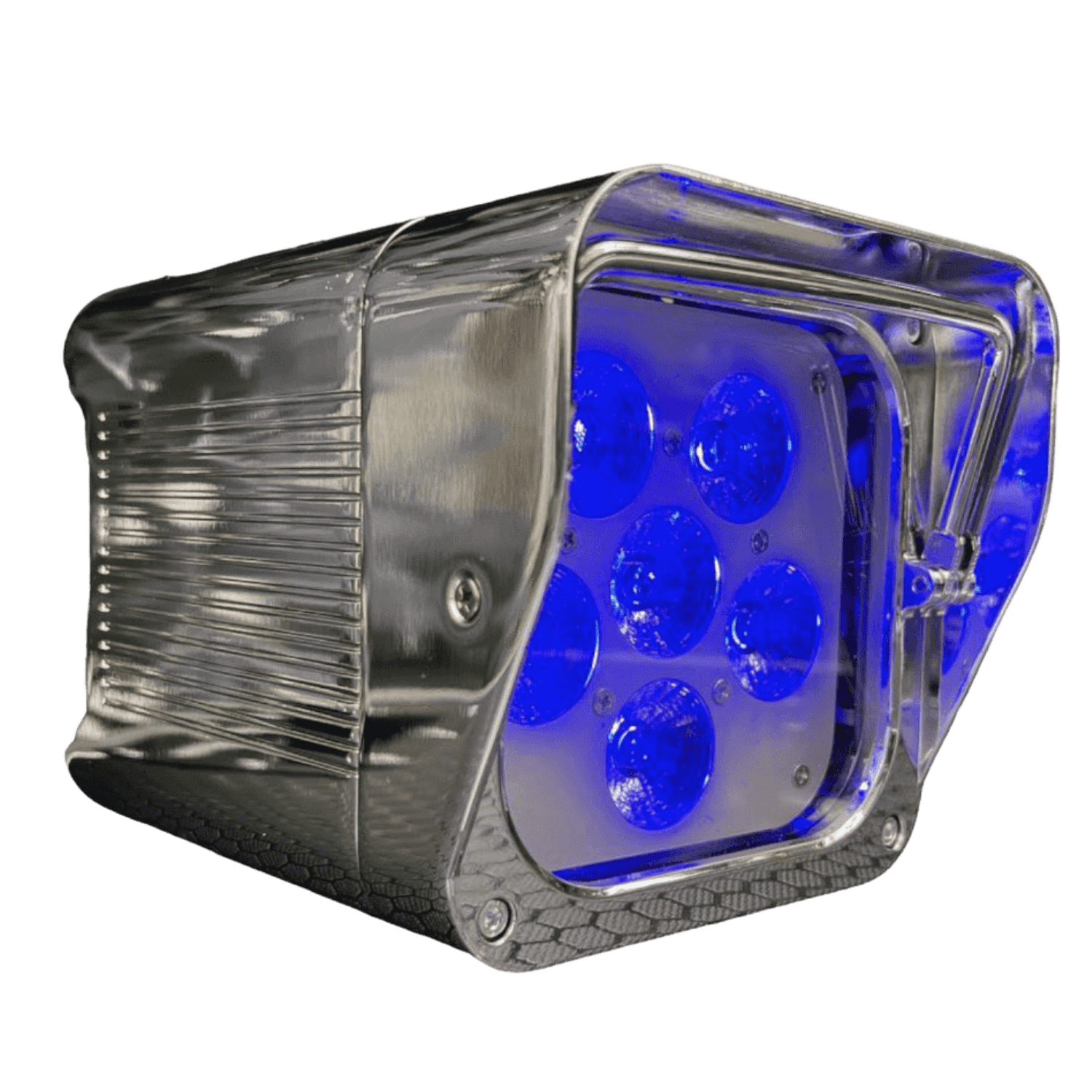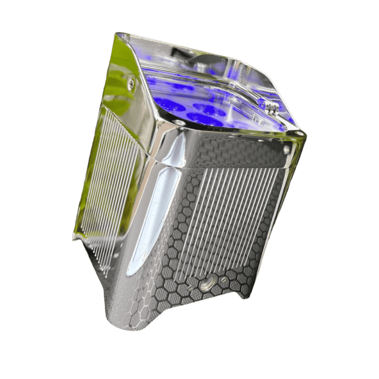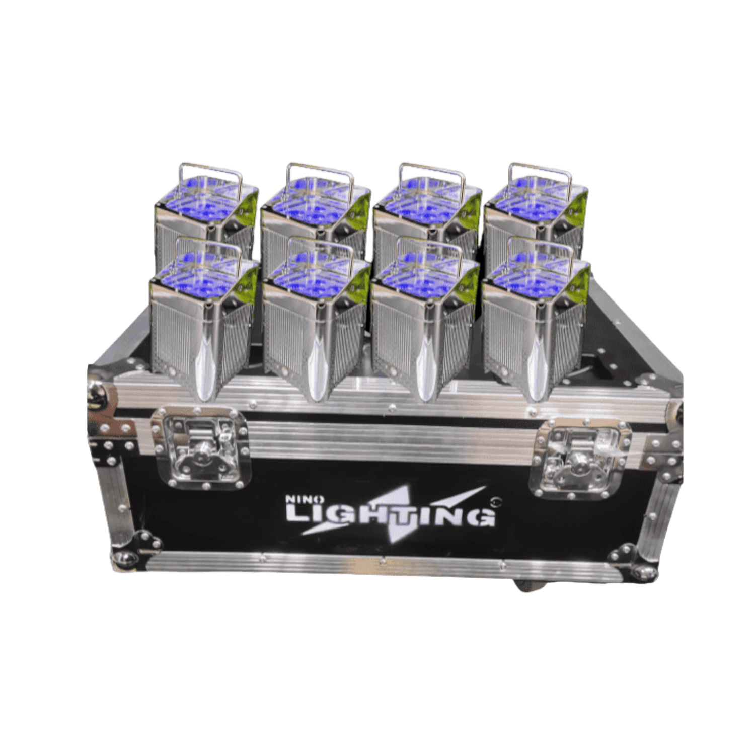 Fly Case da 8 Smart Batt PAR LED Cromati a batteria ricaricabile con controllo wireless e telecomando, composti da 6 luci LED RGBWA-UV 6 in 1 da 18W