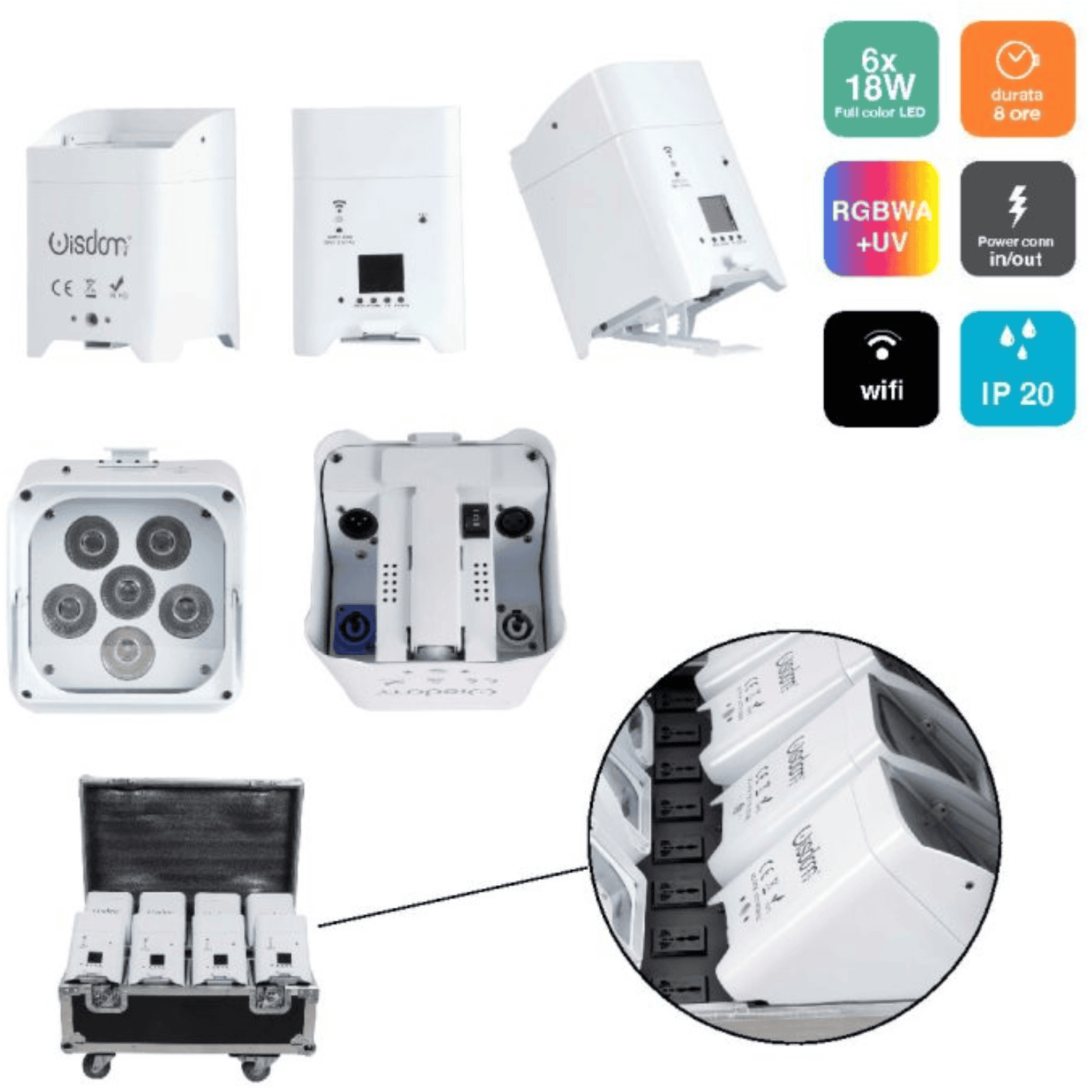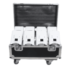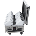 Il flight case professionale incluso รจ dotato di caricabatterie integrato, consentendo la ricarica simultanea di tutti gli uplighter in modo rapido e sicuro. La presenza di maniglie robuste e della struttura rinforzata rende il trasporto semplice e sicuro anche durante tour o service itineranti.