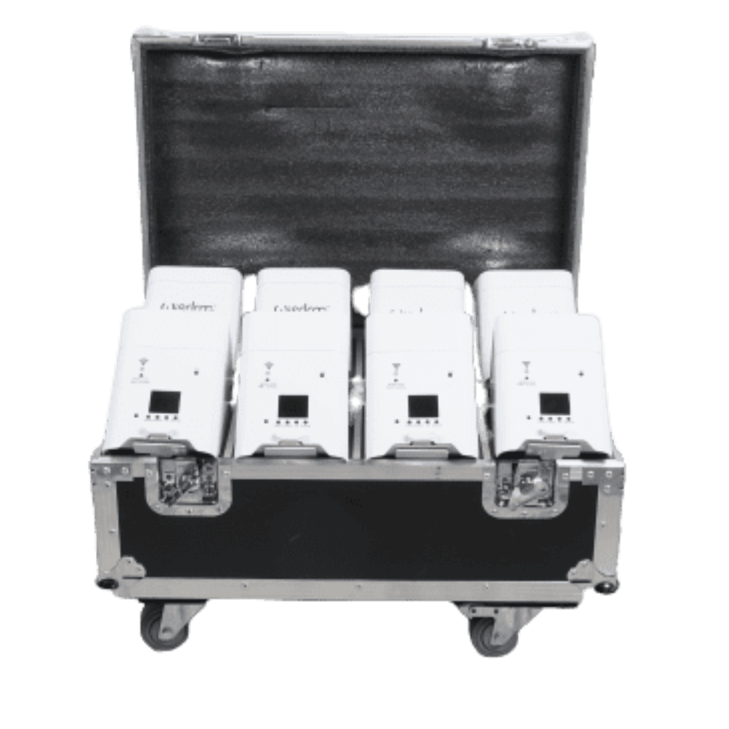 Flycase 8 faretti LED RGBWA-UV a batteria con flight case ricarica, controllo WiFi e DMX wireless. Ideale per matrimoni, eventi e service luci.