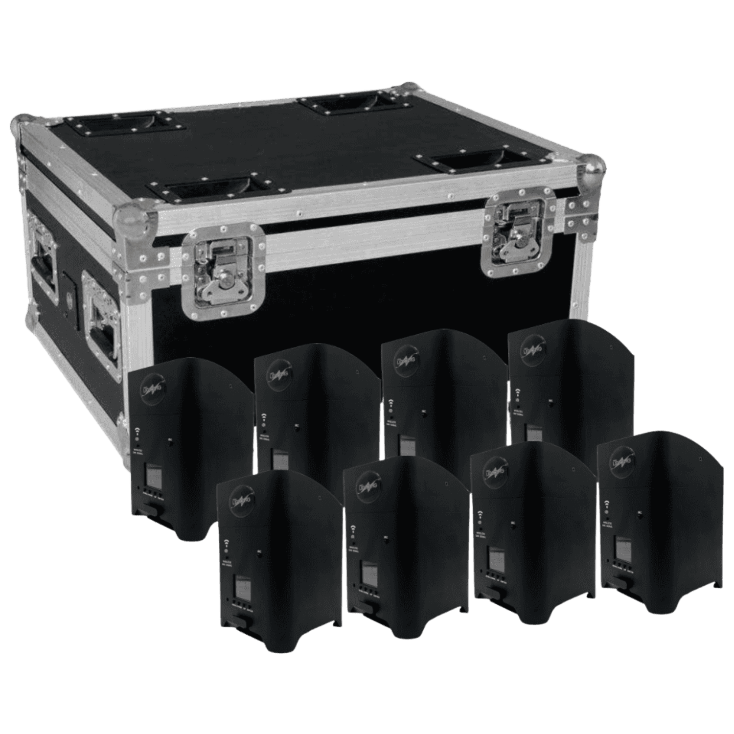 Baule flightcase con 8 Faretti Smart Battery SmartBat PAR LED a batteria ricaricabili con controllo wireless a distanza, composti da 6 led RGBWA-UV 6 in 1 da 18W ciascuno. Solida struttura in alluminio e design moderno e compatto. Grazie alla sua scocca e alla pratica maniglia, nonchรฉ alle ridotte dimensioni, risulta molto robusto e semplice da trasportare. Nella parte inferiore si trova una staffa inclinabile per poter orientare il faretto una volta posizionato a pavimento. Controllo tramite Wi-Fi (smartphone e tablet), DMX (wireless e cablato), oppure funzionamento in automatico o musicale. Tramite il DMX e direttamente dal display a led รจ possibile controllare: luminositร complessiva, luminositร singoli colori, strobo, macro.