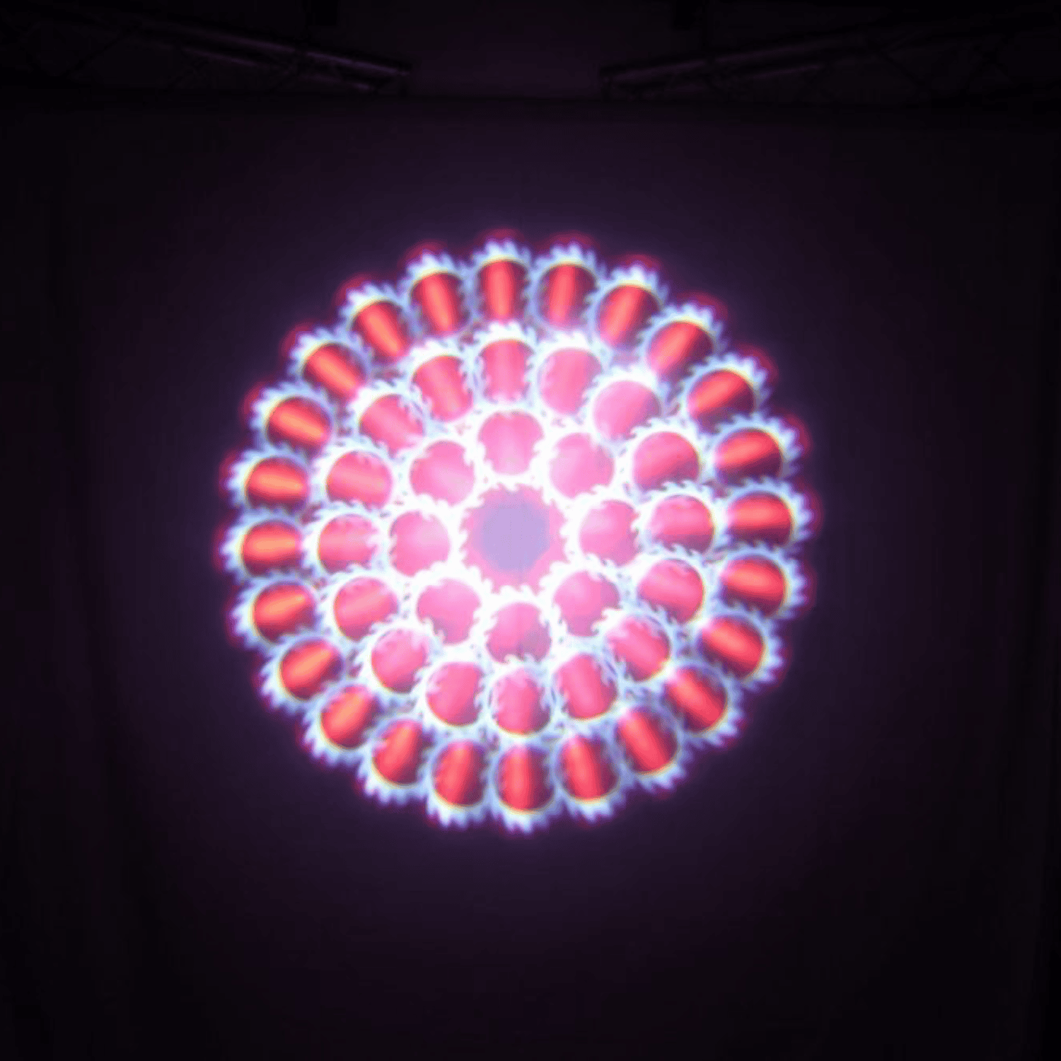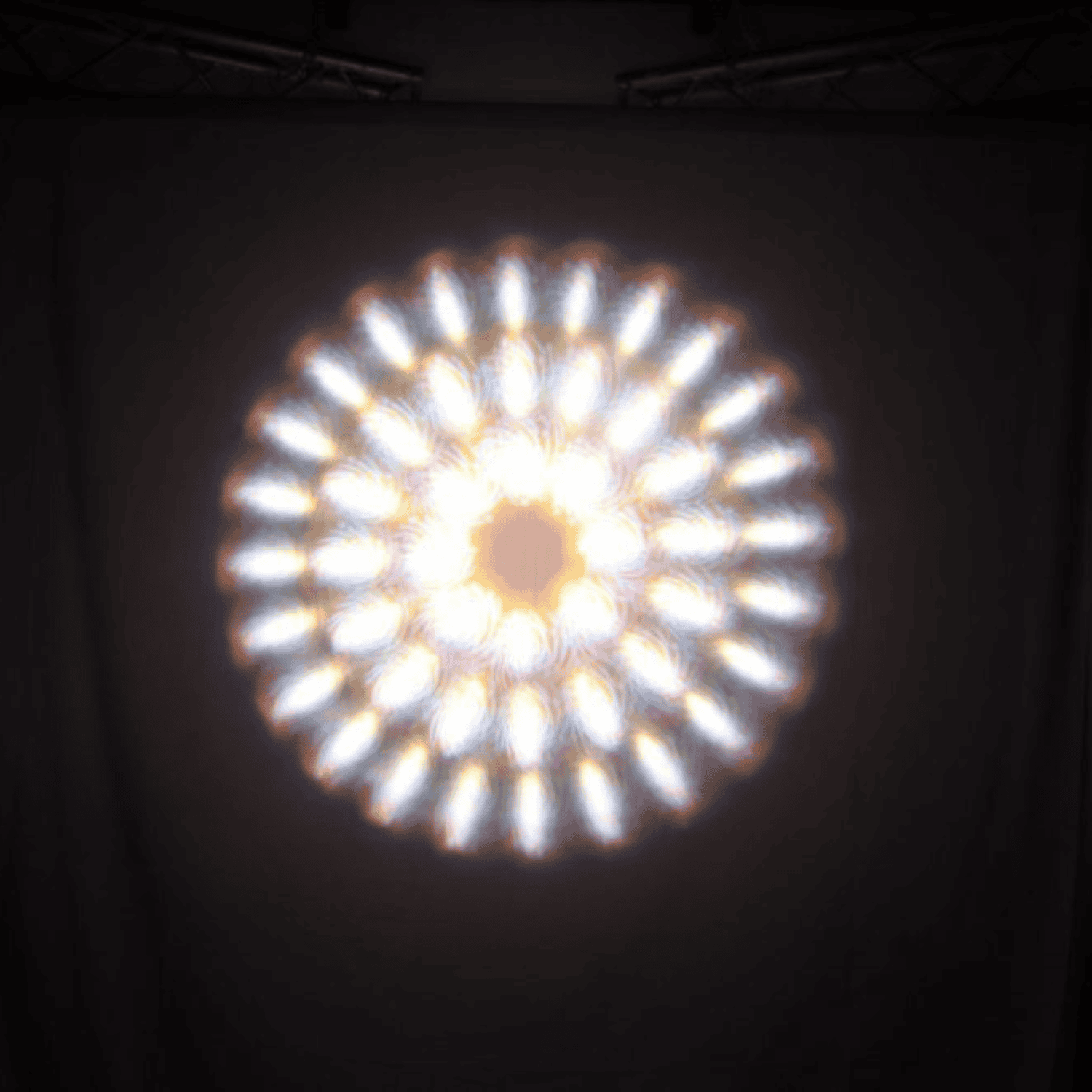 Dal punto di vista creativo, la dotazione effetti è completa e professionale. La ruota colori include 14 colori più il bianco, con transizioni fluide e uniformi. La ruota gobos ospita 17 pattern, di cui 5 gobos dicroici, capaci di generare proiezioni luminose intense e tridimensionali. Il prisma indicizzato e rotante a 16 facce, con rotazione bidirezionale e funzione di posizionamento, consente di moltiplicare il fascio in modo spettacolare, ampliando notevolmente le possibilità scenografiche. Tutti i parametri, inclusi prisma, focus e dimmer, sono regolabili in modo lineare da 0 a 100%, offrendo un controllo estremamente preciso.