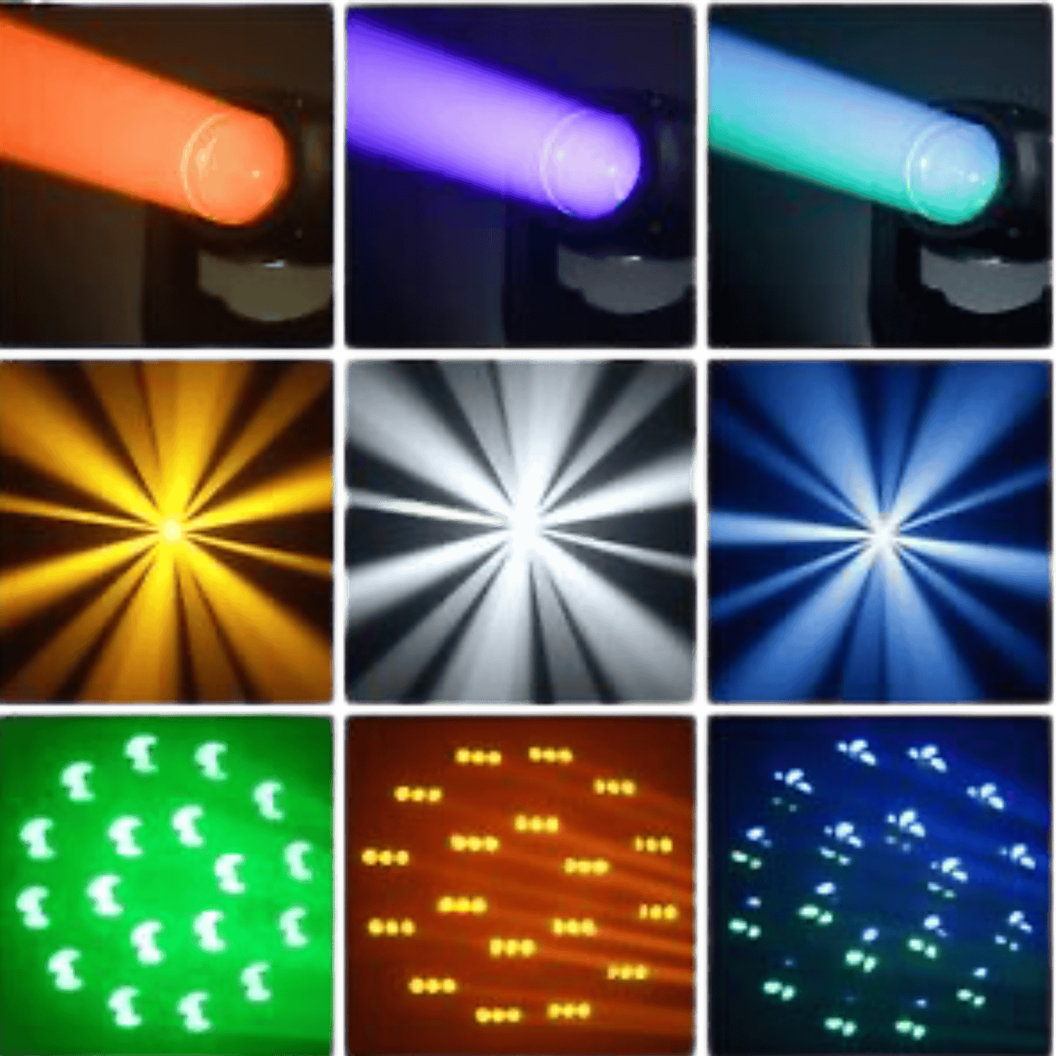 La sorgente luminosa a scarica da 230W 7R garantisce un fascio di luce estremamente concentrato, potente e definito, capace di attraversare ambienti di grandi dimensioni mantenendo sempre un’elevata intensità luminosa. Il classico effetto Beam stretto consente di creare colonne di luce precise, movimenti rapidi e spettacolari giochi visivi, rendendo queste teste mobili perfette sia per show dinamici che per utilizzi architetturali.