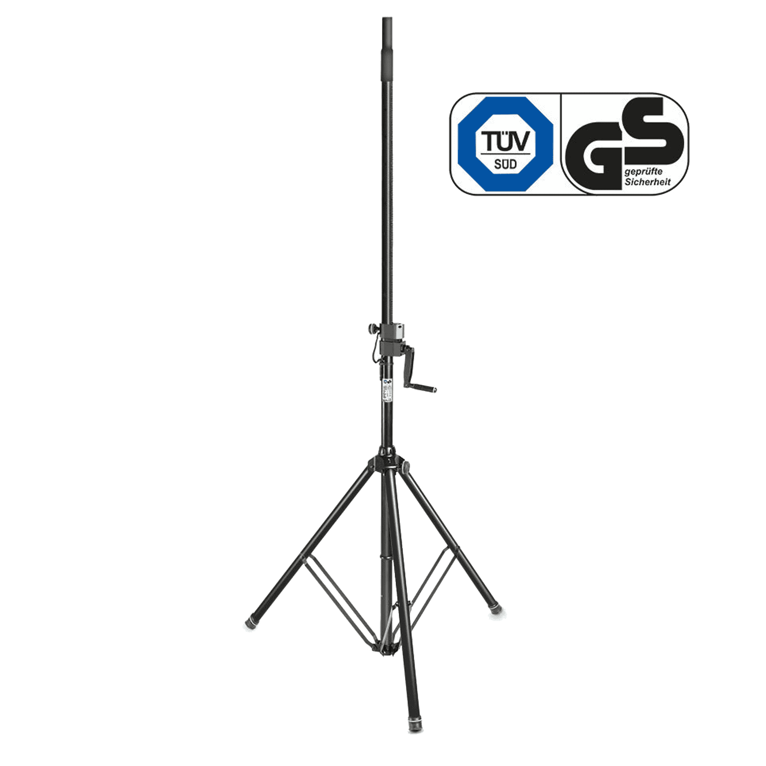 Il Gravity GSP 4722 B รจ un robusto supporto per altoparlante con pratico azionamento a manovella e cremagliera che consentono di portare le casse allโaltezza desiderata. Realizzato in solido tubo dโacciaio, รจ dotato di tre piedini pieghevoli uniti a un solido anello di tenuta in alluminio pressofuso. Il tubo telescopico si fissa con una maneggevole vite ad aletta e perno di fissaggio. Lo stativo a manovella si puรฒ regolare a un’altezza compresa tra 1,5 m e 2,4 m. Il supporto รจ certificato TรV/GS.