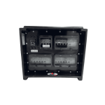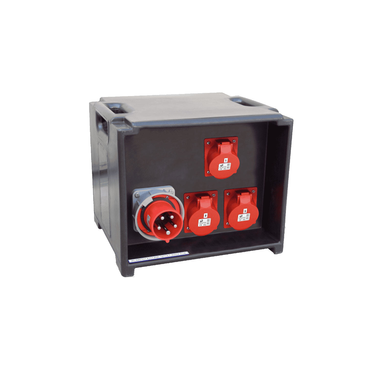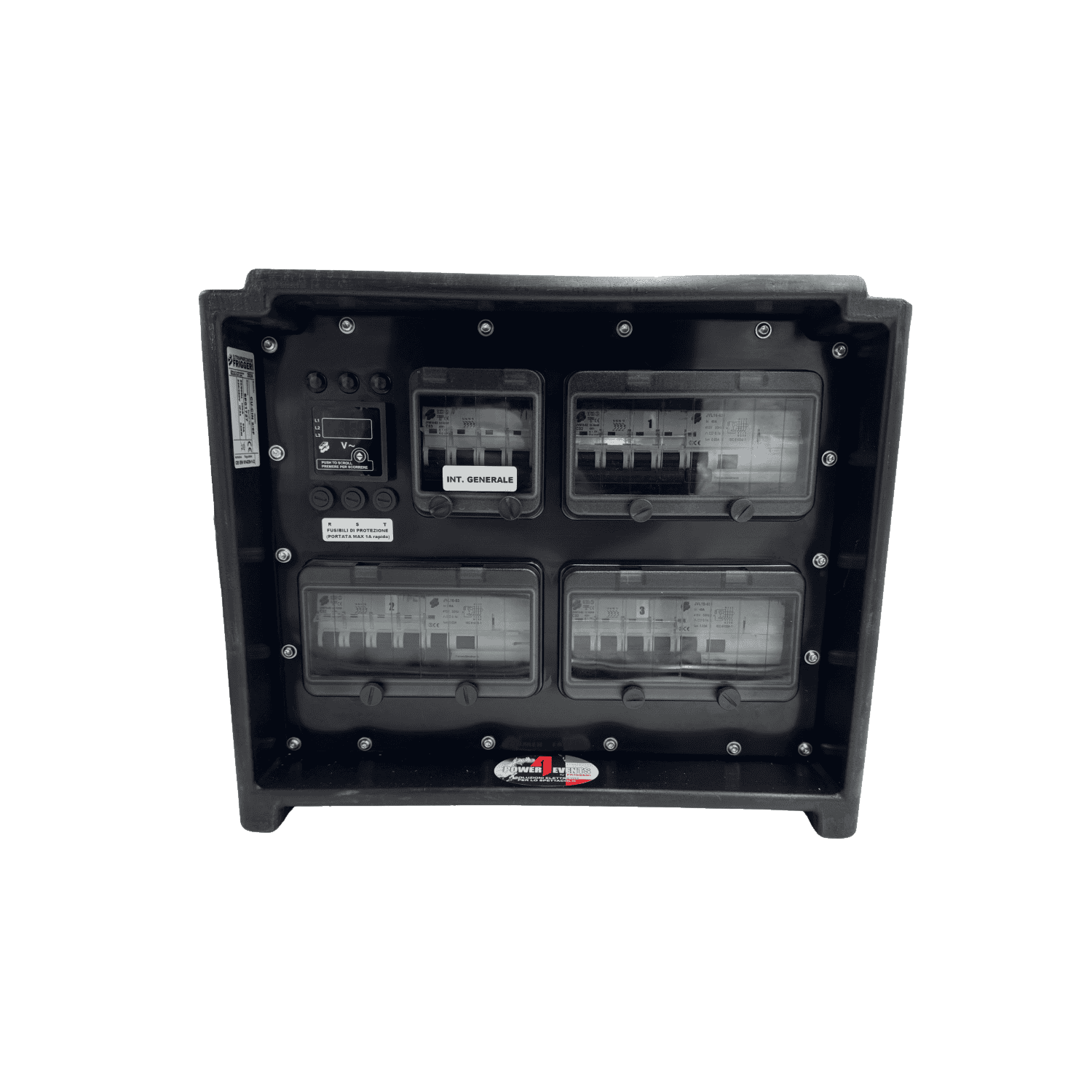Cassetta in polietilene antiurto in colore nero con maniglie ergonomiche per il trasporto integrate configurazione prese-interruttori fronte/retro. Prese protette individualmente, spie di segnalazione rete LED sulle 3 fasi e voltmetro digitale trifase a pannello