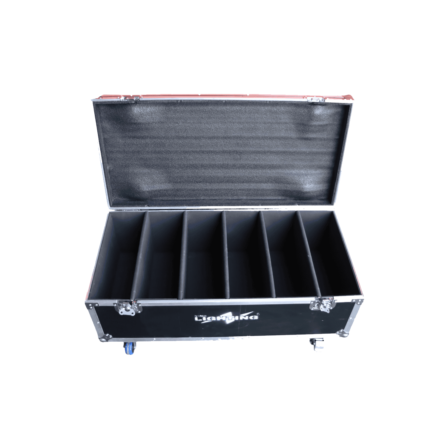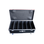 Baule flightcase vuoto rigido per il trasporto di sei accecatori atomic. Aprendo il baule avremo 6 spazi vuoti dove poter mettere al sicuro gli accecatori. Il baule รจ realizzato con materiale resistente con bordi e rifiniture in alluminio, con maniglie laterali ad entrambi i lati e chiusura a farfalla. Il baule รจ dotato di ruote risultando comodo per il trasporto sicuro ed efficace.