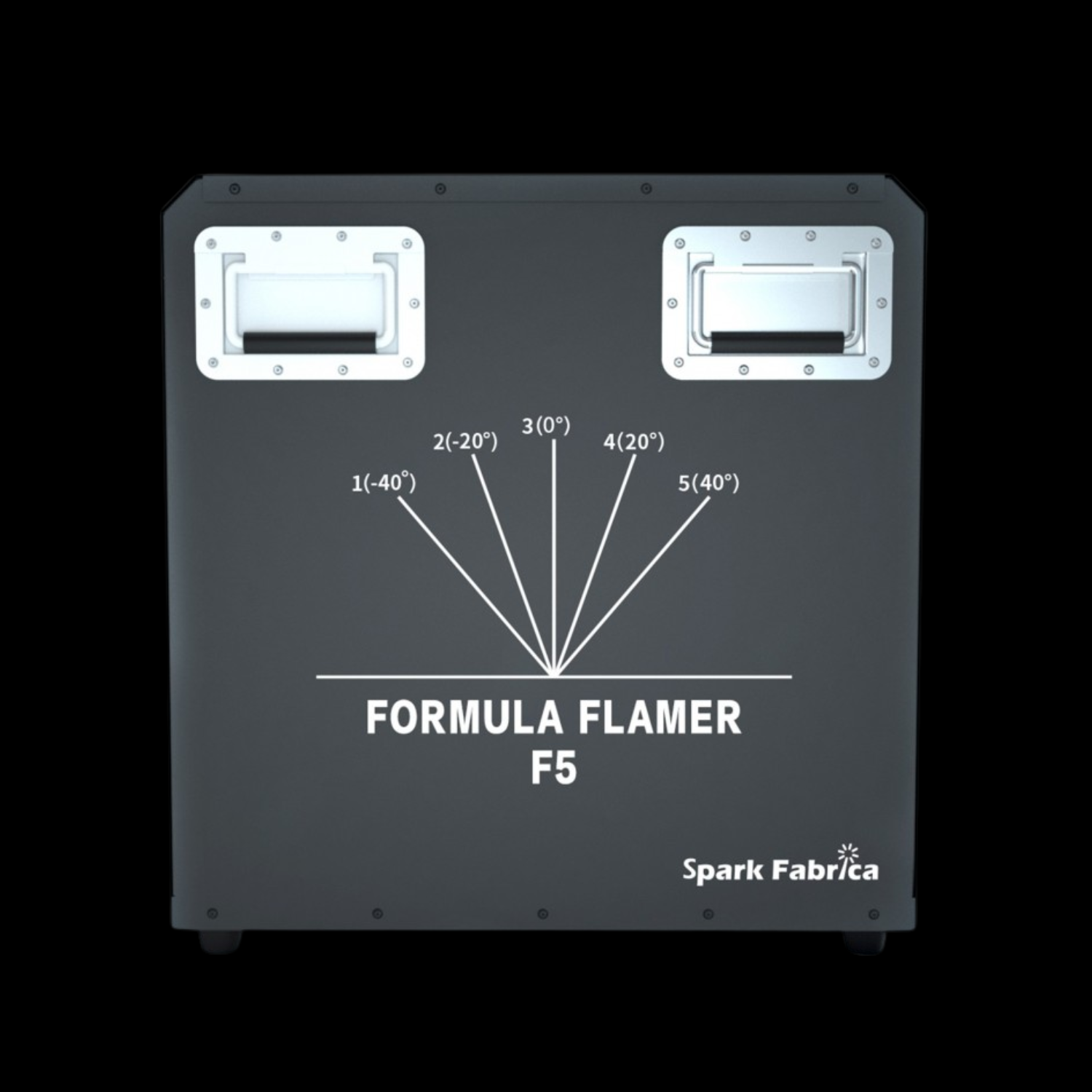Il Lanciafiamme F5 permette di generare getti di fiamma che raggiungono un’altezza di 8–10 metri in assenza di vento, offrendo un impatto visivo potente e scenografico. La macchina utilizza Isopar come combustibile, sicuro ed affidabile, e ogni ugello dispone di doppia pompa e doppia accensione per garantire la massima precisione e affidabilità. L’angolo di intervallo dei getti è regolabile fino a 80°, con possibilità di impostare cinque posizioni di distribuzione a -40°, -20°, 0°, +20° e +40°, permettendo di adattare i flussi di fiamma alle diverse scenografie e necessità del palco.