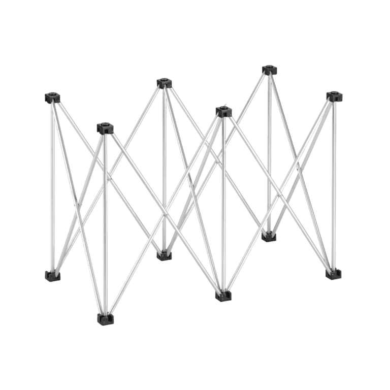 Tavolo DJ professionale con telaio in acciaio, copertura in tessuto nero o bianco e borse da trasporto incluse. Struttura solida, design elegante e montaggio rapido per eventi, club, fiere e setup DJ professionali