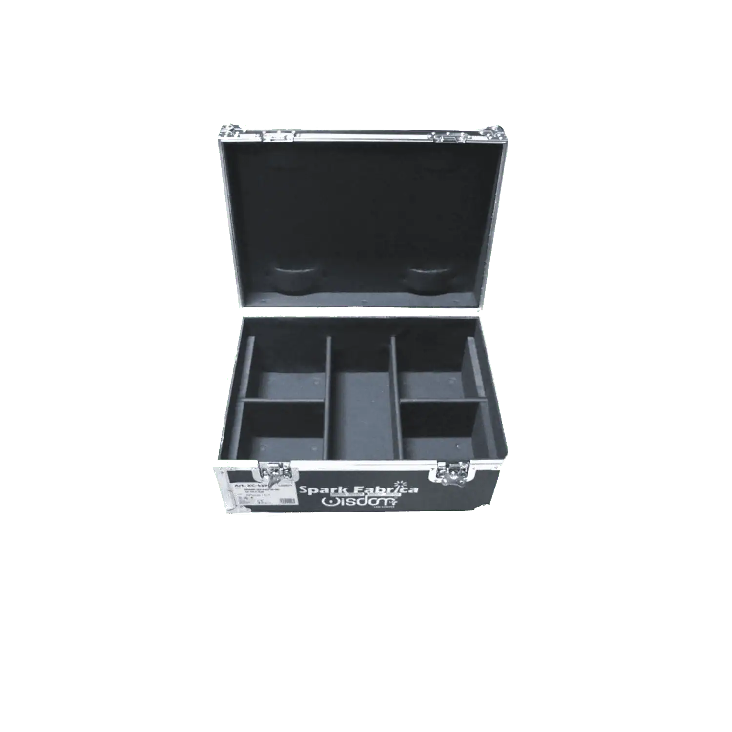 Baule Flight case rigido per il trasporto di 4 macchine Spark scintilla fredda 600W senza ulteriori problemi di spostamento! Aprendo il baule avremo 4 vani interni per le Spark SF-05 e un vano per cavi di alimentazione e accessori. IL Baule è resistente con bordi in alluminio, maniglie laterali e chiusure a farfalla. NB Il baule può presentare segni di usura.